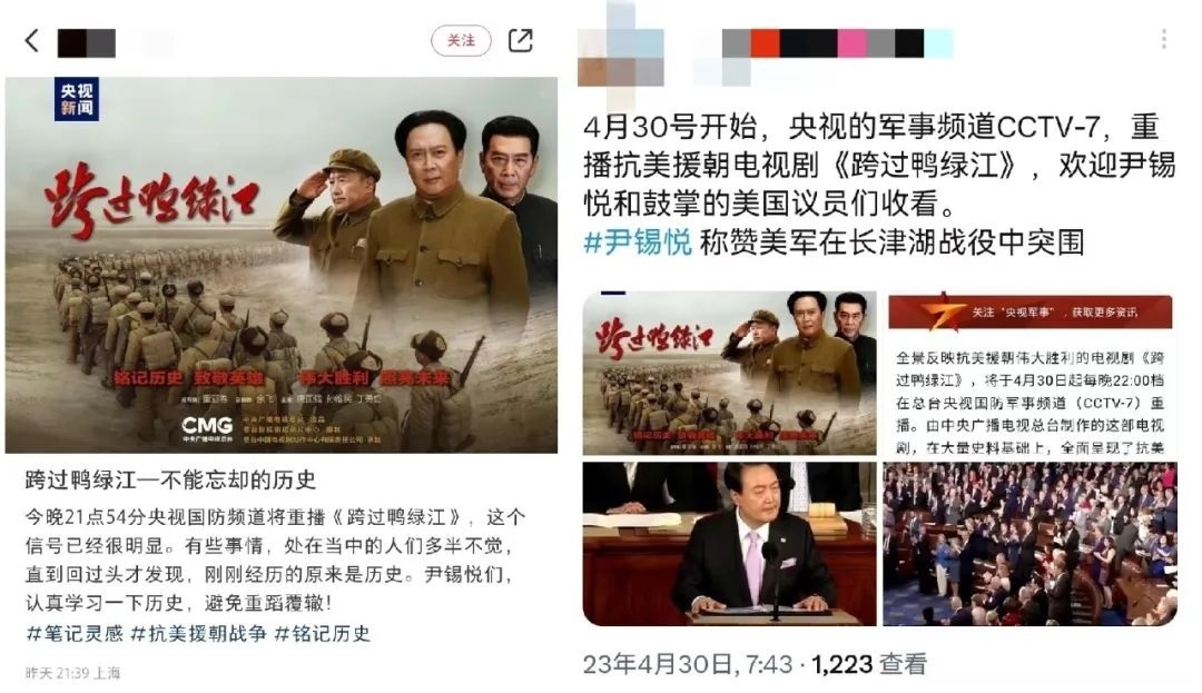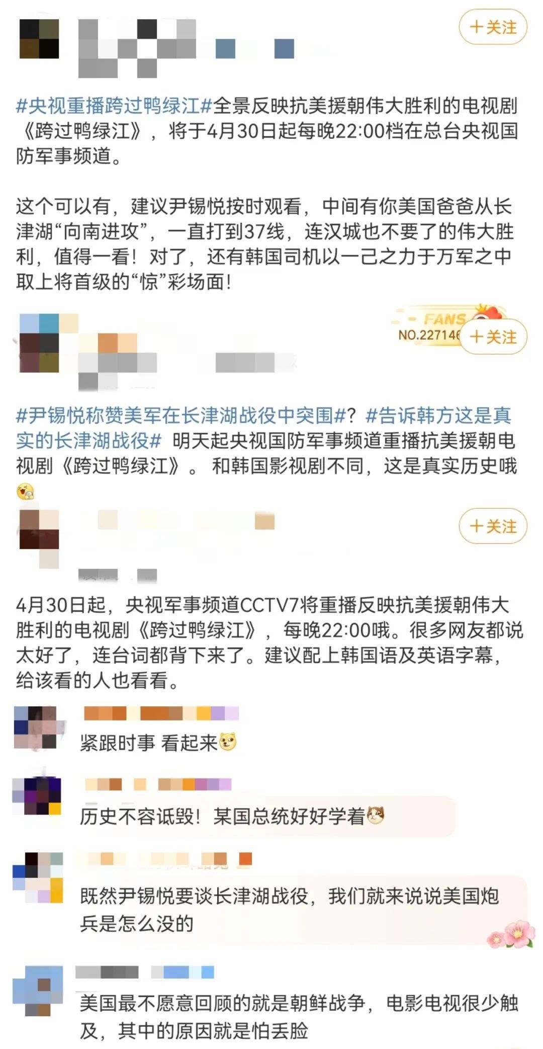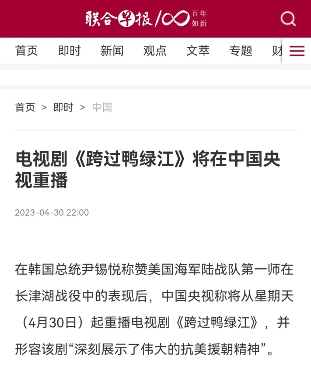 新加坡《聯(lián)合早報(bào)》更在4月30日晚10點(diǎn)準(zhǔn)時(shí)發(fā)布文章《電視劇<跨過鴨綠江>將在中國(guó)央視重播》,開篇明確重點(diǎn):在韓國(guó)總統(tǒng)稱贊美國(guó)海軍陸戰(zhàn)隊(duì)第一師在長(zhǎng)津湖戰(zhàn)役中的表現(xiàn)后,中國(guó)央視稱將從星期天(4月30日)起重播電視劇《跨過鴨綠江》。