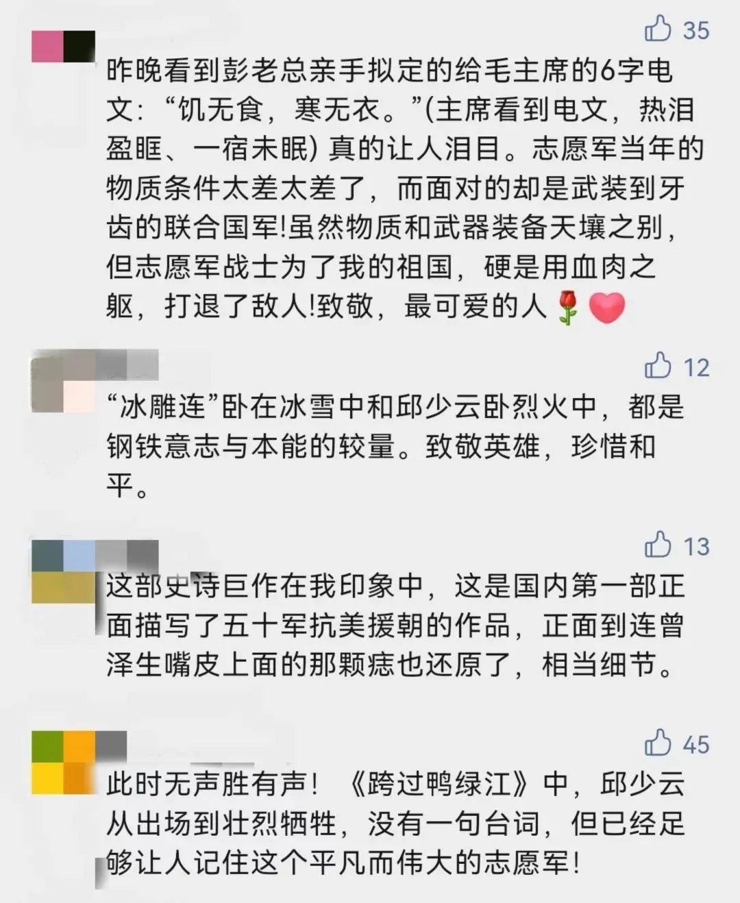 “抗美援朝絕對(duì)是值得紀(jì)念和謳歌的奇跡!這部電視劇是一部愛國(guó)主義教育的活教材!”這是網(wǎng)友對(duì)這部劇的評(píng)價(jià)。