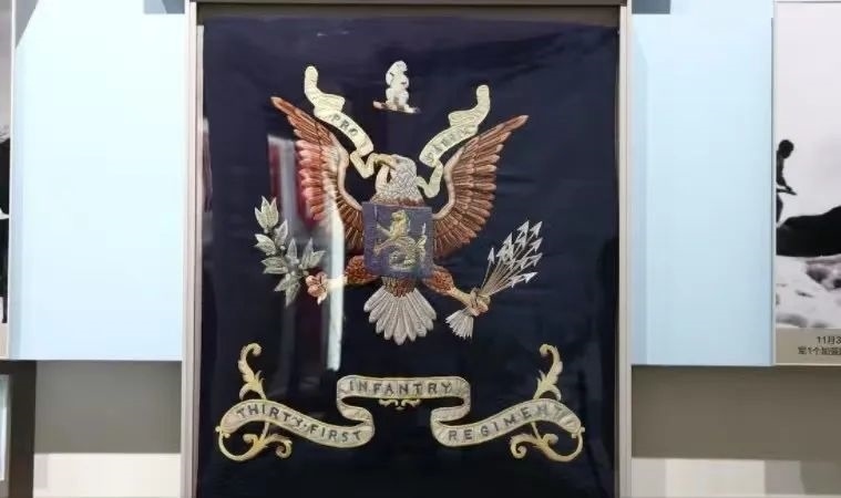 這是陳列在軍博的美軍“北極熊團(tuán)團(tuán)旗”?!犊邕^鴨綠江》真實(shí)還原了長(zhǎng)津湖戰(zhàn)役中,志愿軍全殲美北極熊團(tuán)并繳獲其團(tuán)旗的全過程。