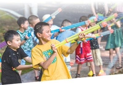 安徽省蕪湖市孫村鎮(zhèn)一家鄉(xiāng)村房車露營地里,小朋友們在開心地打水仗。肖本祥攝(人民視覺)