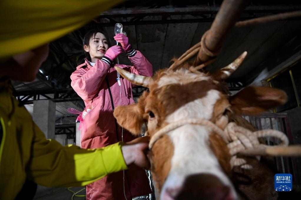 白婳在固原市原州區(qū)開城鎮(zhèn)雙泉村為村民李百武的一頭牛縫合傷口(4月18日攝)。