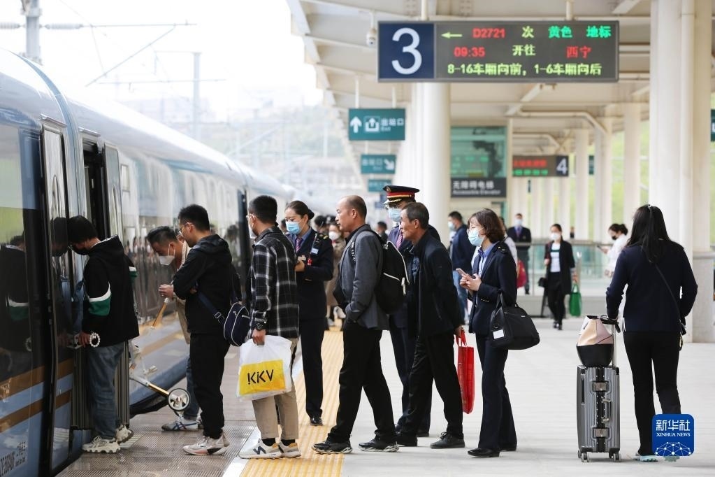 5月3日,旅客在寶蘭高鐵甘肅定西北站站臺(tái)乘車(chē)出行。