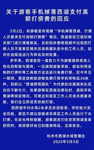 ·西湖景區(qū)回應高價撈手機:非工作人員,接到求助會免費打撈。
