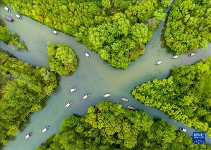5月2日,游客在江蘇省泰州市姜堰區(qū)溱湖國家濕地公園內乘坐搖櫓船游玩。