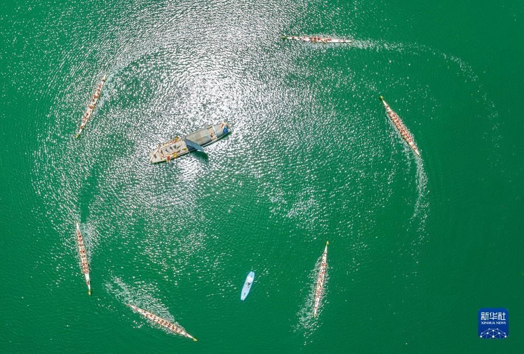 5月1日,湖北省宜昌市秭歸縣歸州鎮(zhèn)萬古寺村村民與游客共同劃龍舟(無人機照片)。