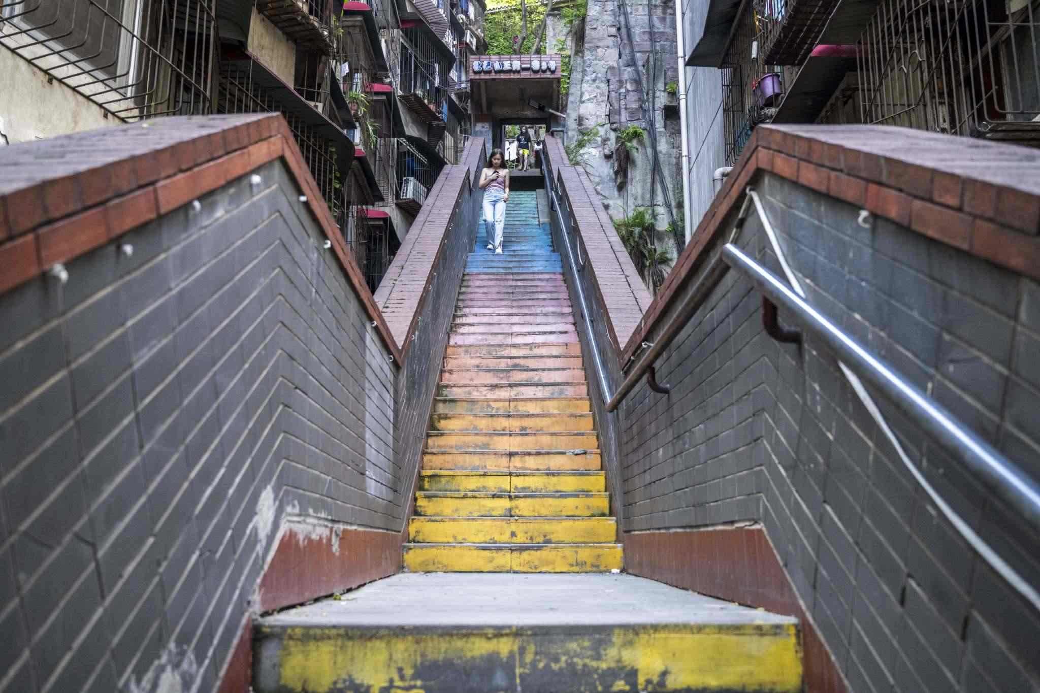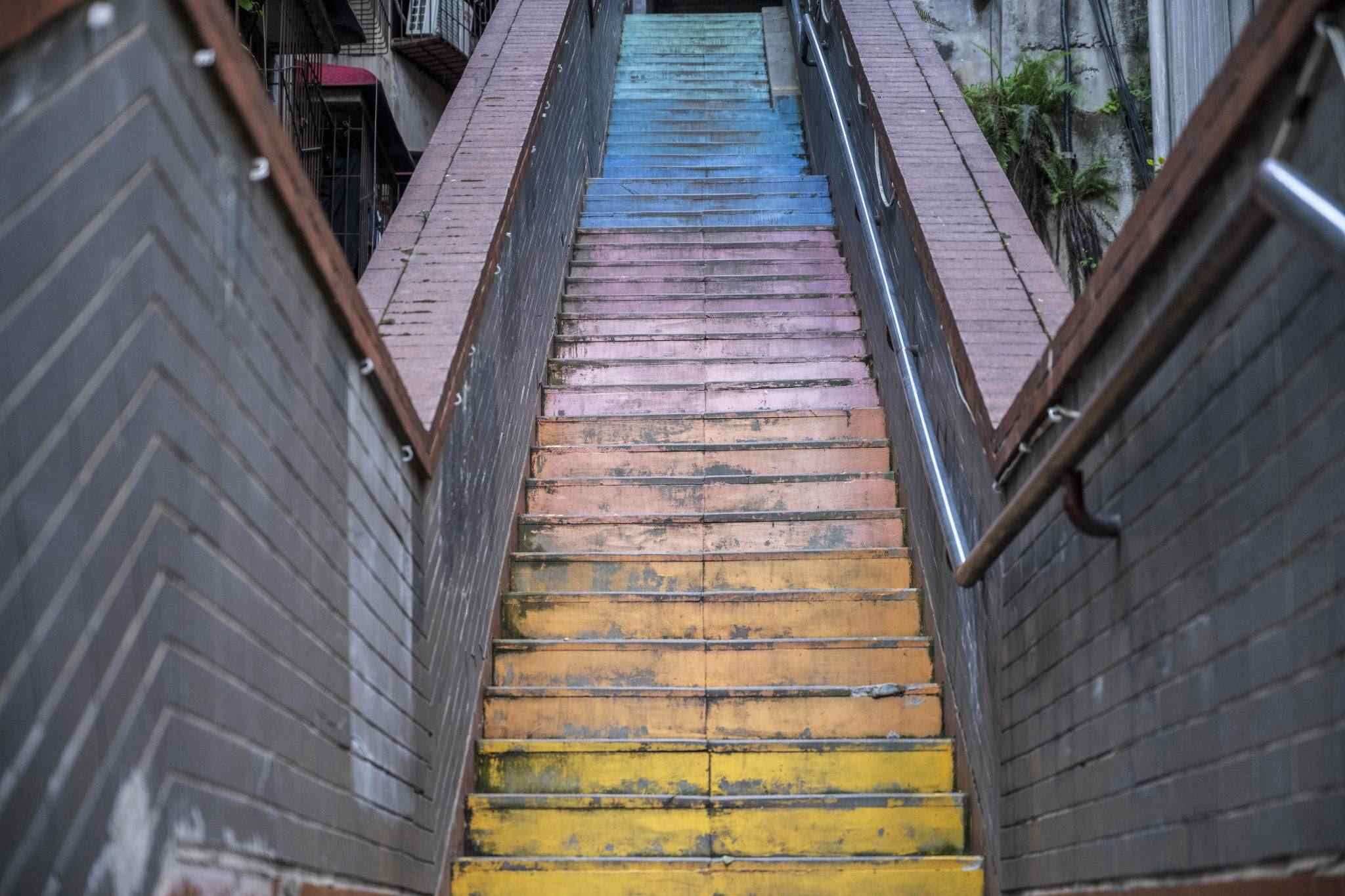 “彩虹樓梯”位于重慶渝中區(qū)枇杷山正街的居民樓間,高約20米,共有50多級階梯,極具山城特色。經(jīng)過多種顏色涂鴉后,吸引不少市民和攝影愛好者“打卡”。視覺中國