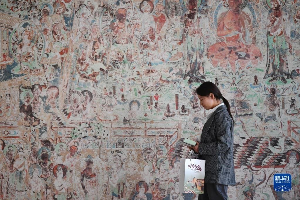 敦煌研究院文物數(shù)字化保護(hù)團(tuán)隊(duì)創(chuàng)意營(yíng)銷(xiāo)人員廖雪婷從一幅高保真復(fù)制壁畫(huà)前走過(guò)(4月25日攝)。