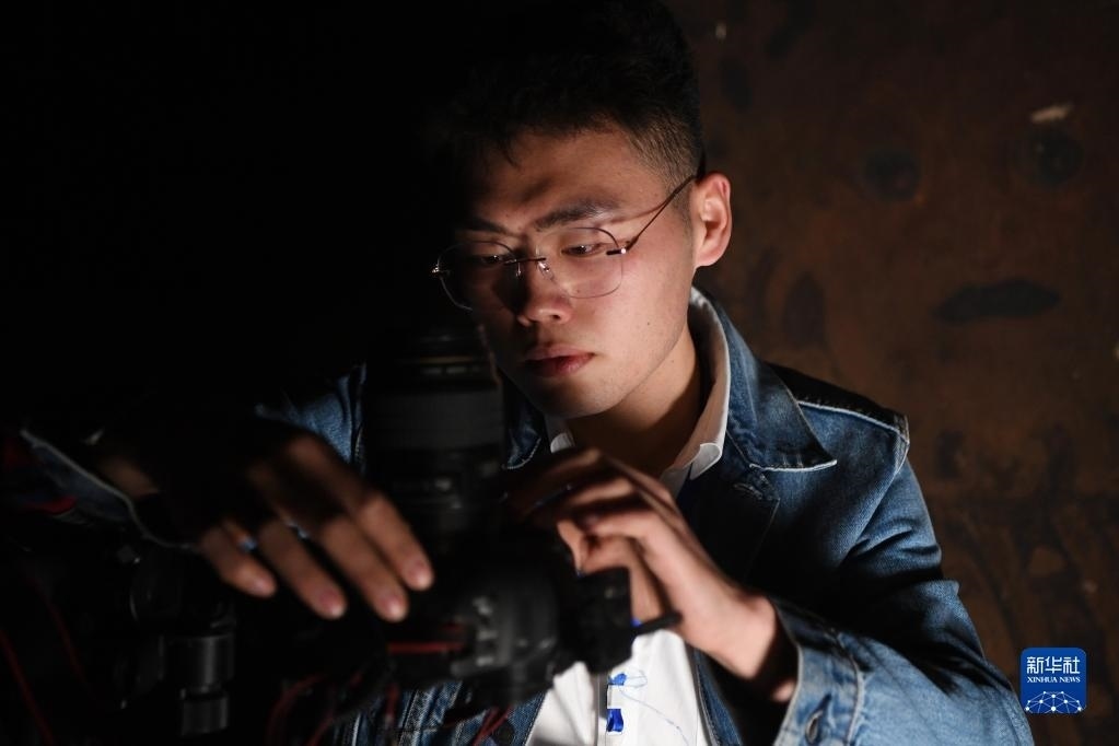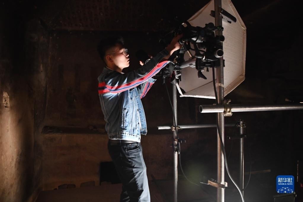 敦煌研究院文物數(shù)字化保護(hù)團(tuán)隊(duì)圖像采集人員熊業(yè)騰在洞窟內(nèi)調(diào)試設(shè)備,準(zhǔn)備進(jìn)行壁畫(huà)圖像采集(4月25日攝)。