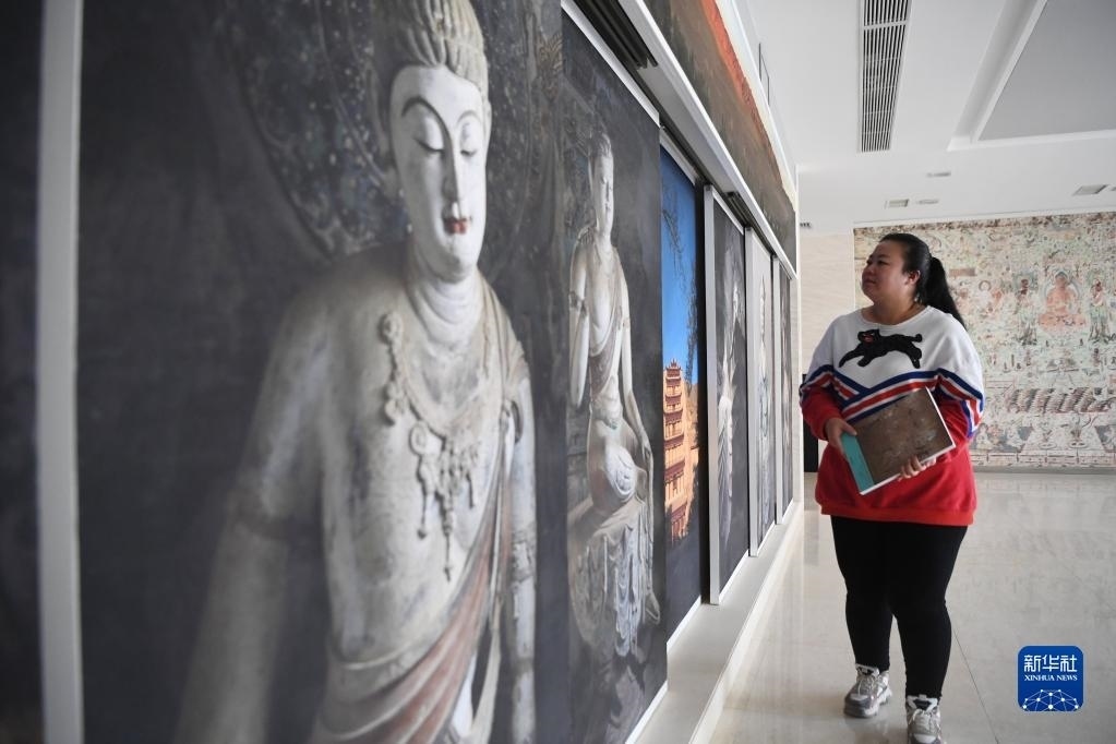 敦煌研究院文物數(shù)字化保護(hù)團(tuán)隊(duì)圖像處理人員年海麗從莫高窟照片墻前走過(guò)(4月25日攝)。