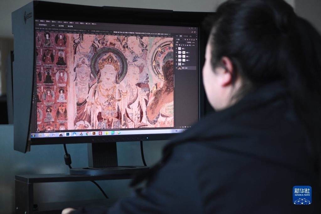 敦煌研究院文物數(shù)字化保護(hù)團(tuán)隊(duì)圖像處理人員年海麗在拼接壁畫(huà)圖像(4月25日攝)。