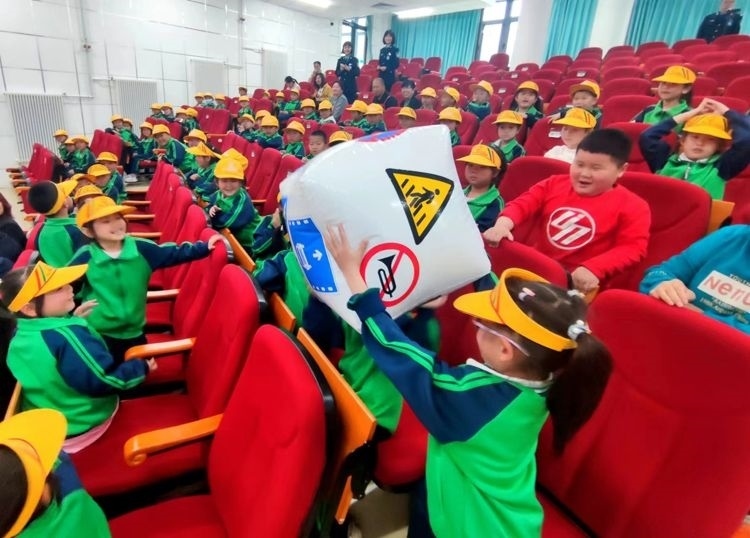 學(xué)警教同學(xué)識(shí)別交通道路標(biāo)志牌。