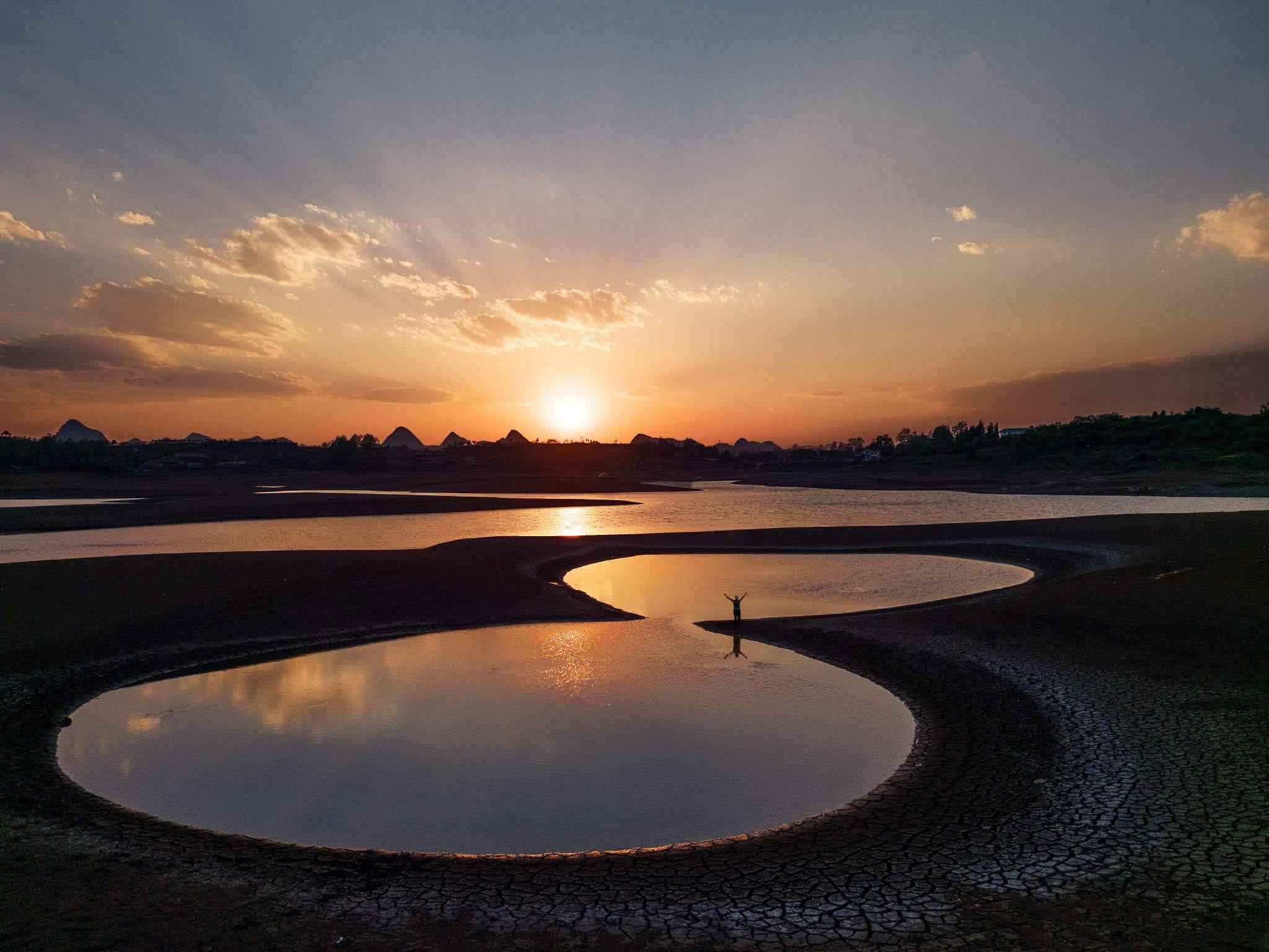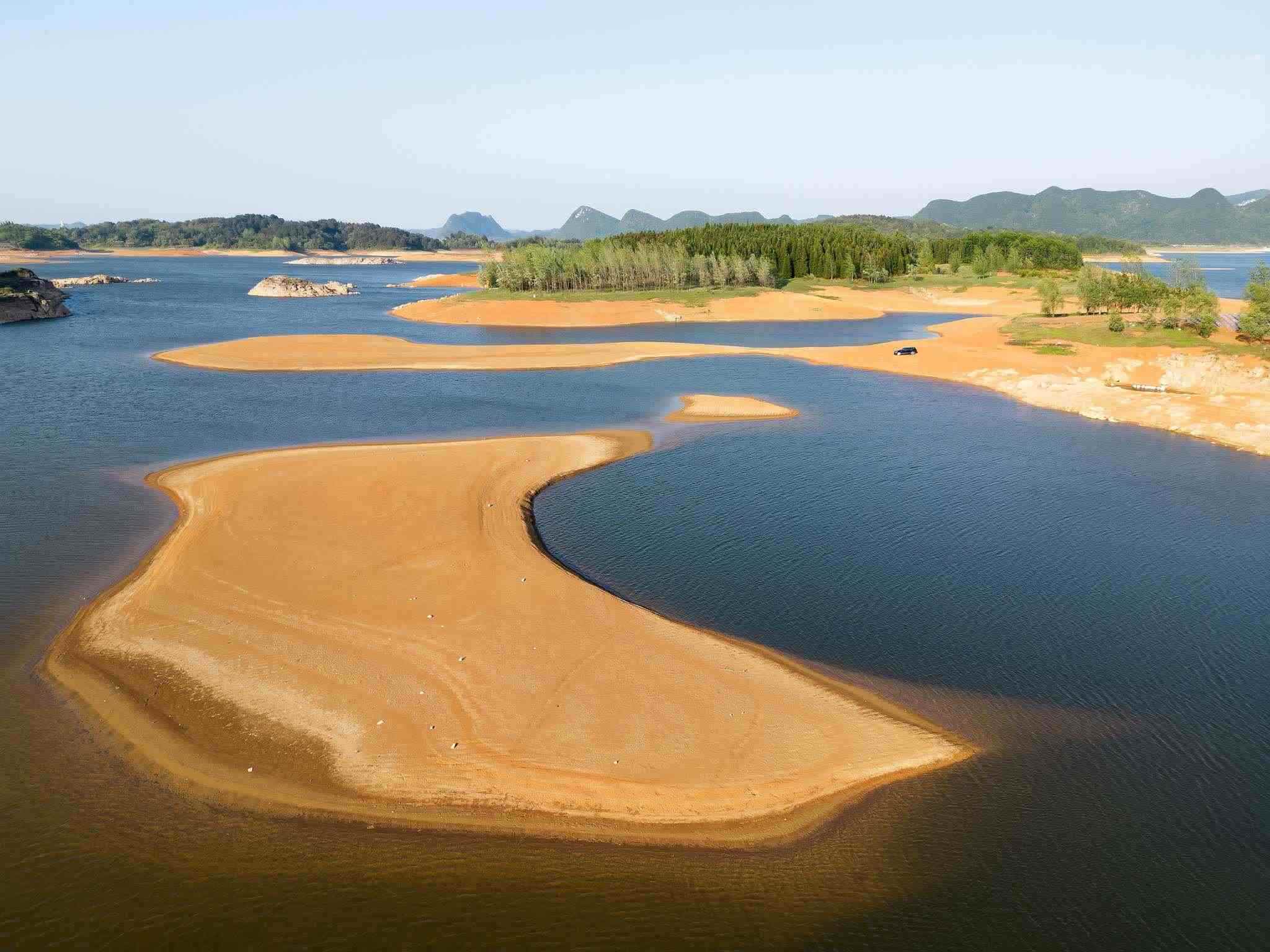 2023年5月2日,貴陽(yáng),紅楓湖水位線下降,湖底大面積裸露,猶如水上丹霞。