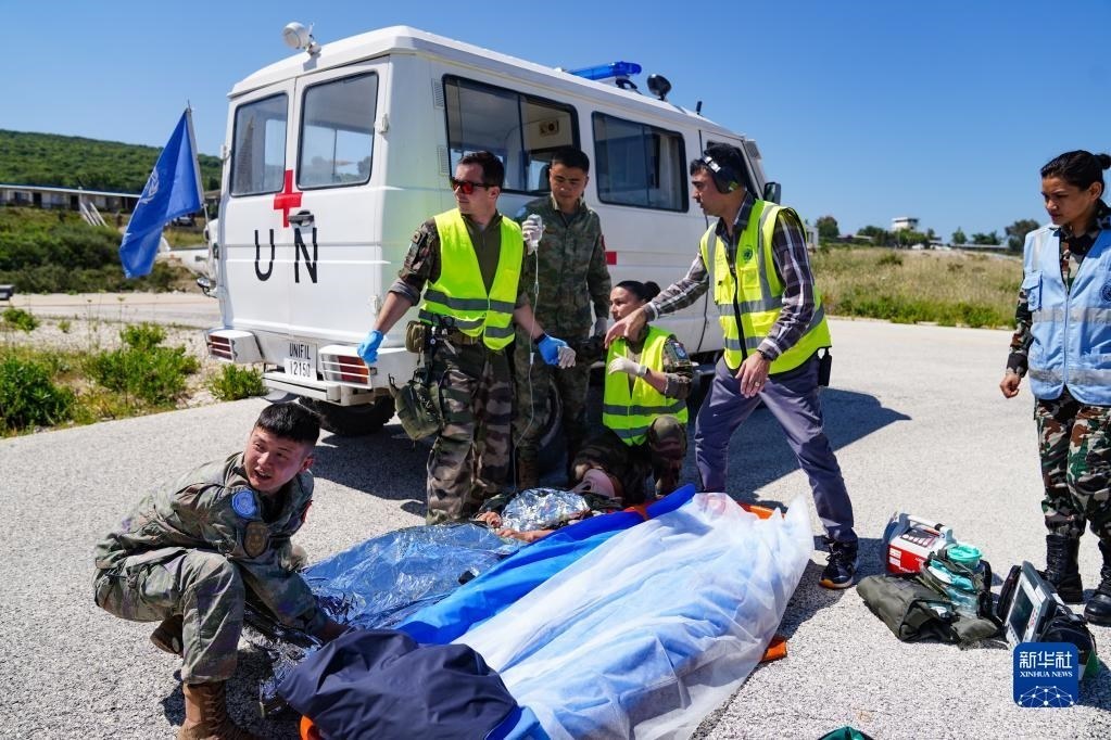 5月3日,在黎巴嫩南部邊境“藍(lán)線”附近雷場,參與演習(xí)的中國第21批赴黎巴嫩維和多功能工兵分隊醫(yī)療組對“傷員”傷情進(jìn)行前期處置。