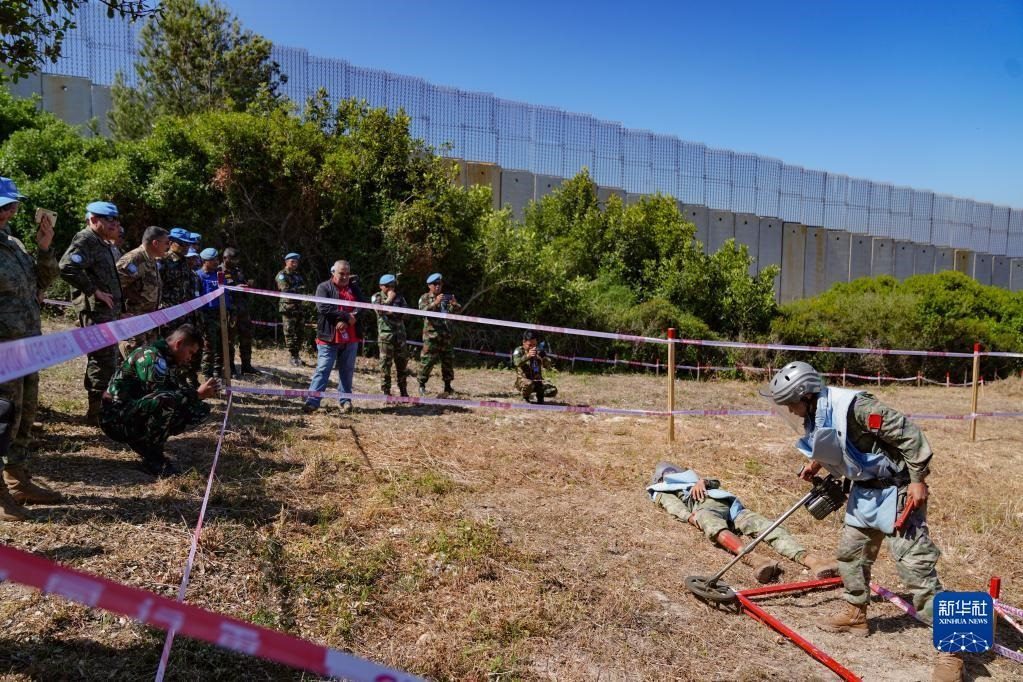5月3日,在黎巴嫩南部邊境“藍(lán)線”附近雷場,參與演習(xí)的中國第21批赴黎巴嫩維和多功能工兵分隊掃雷作業(yè)手開辟救援通道。