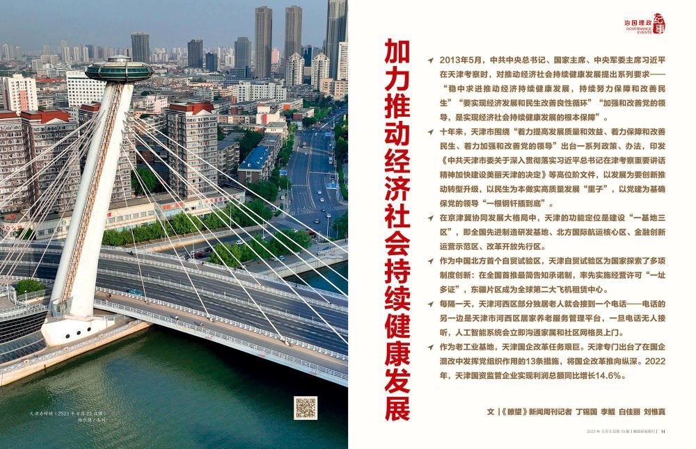 時光回到十年前。2013年5月,中共中央總書記、國家主席、中央軍委主席習(xí)近平在天津考察時,對推動經(jīng)濟(jì)社會持續(xù)健康發(fā)展提出系列要求——“穩(wěn)中求進(jìn)推動經(jīng)濟(jì)持續(xù)健康發(fā)展,持續(xù)努力保障和改善民生”“要實現(xiàn)經(jīng)濟(jì)發(fā)展和民生改善良性循環(huán)”“加強(qiáng)和改善黨的領(lǐng)導(dǎo),是實現(xiàn)經(jīng)濟(jì)社會持續(xù)健康發(fā)展的根本保障”。