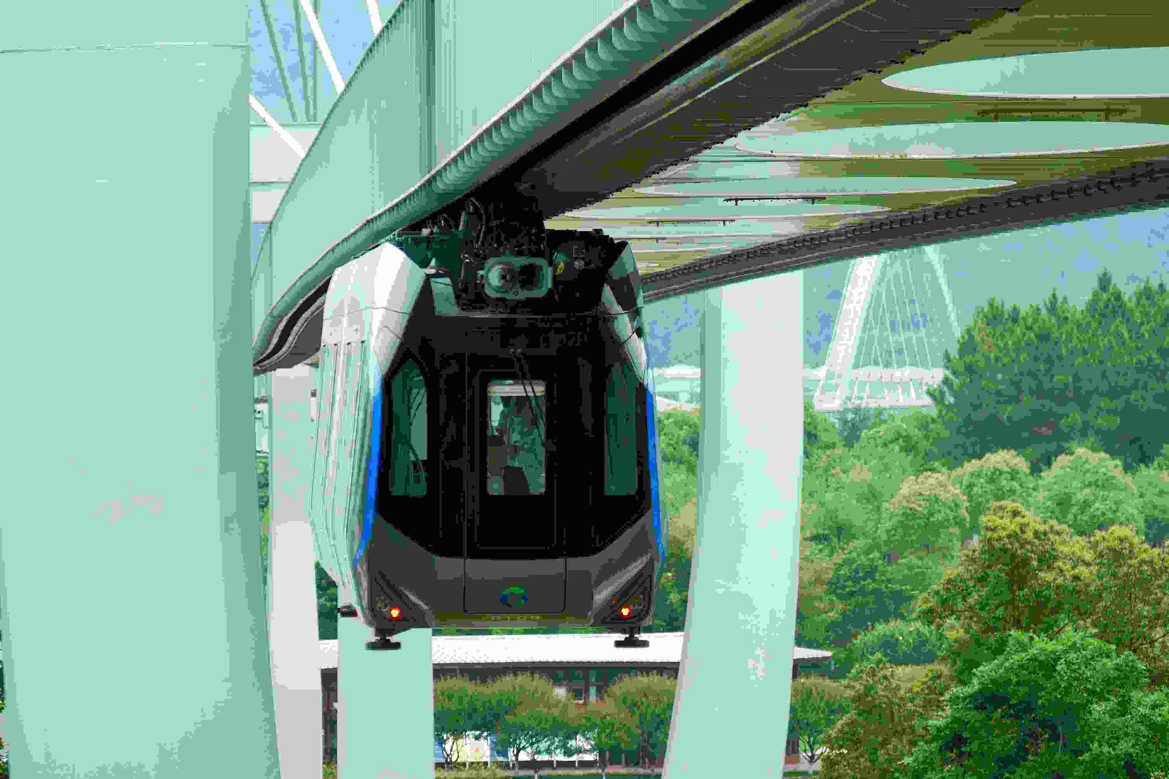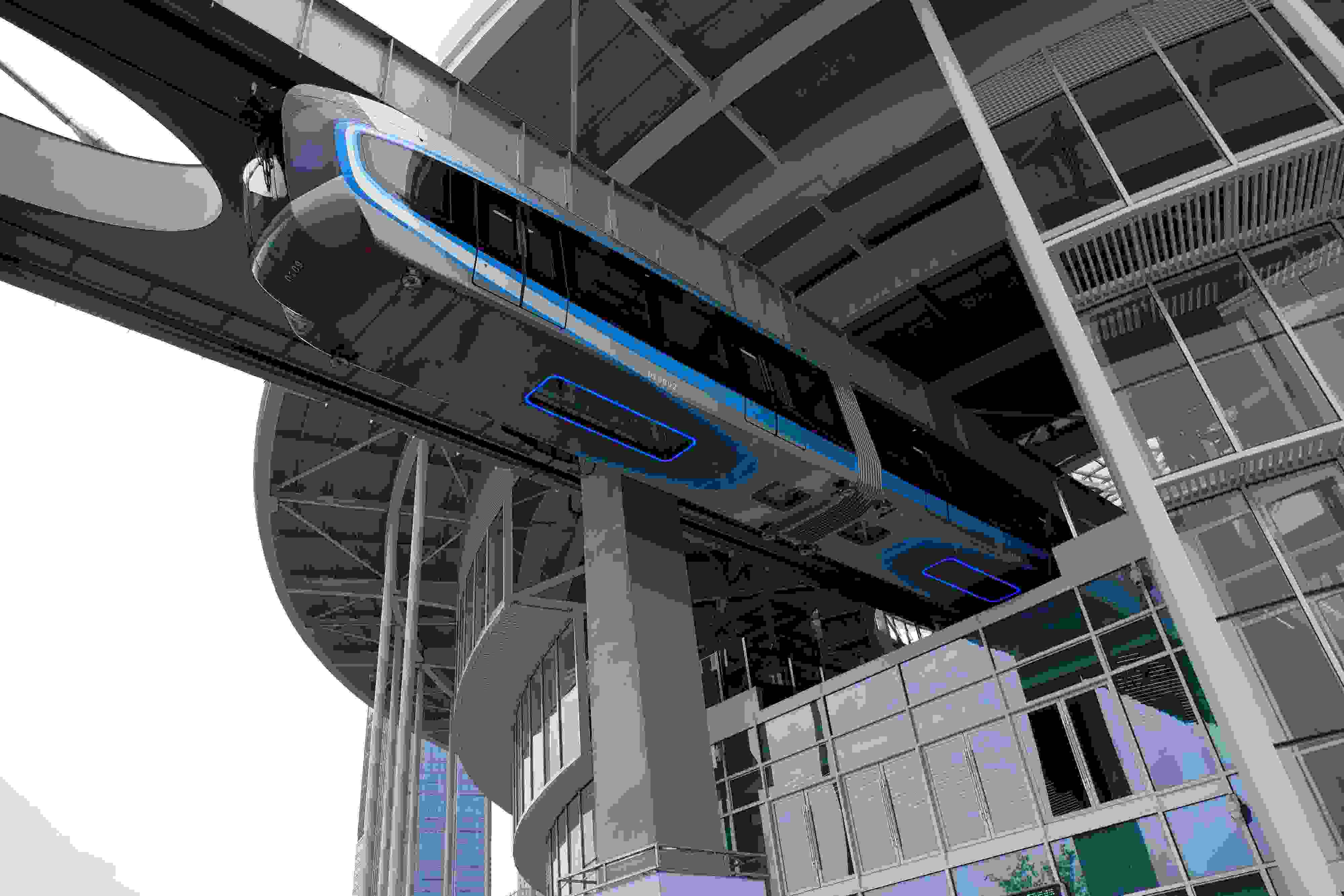 2023年5月11日,武漢,光谷空軌旅游線項(xiàng)目“光谷光子號(hào)”空中軌道列車在東湖高新區(qū)試跑。武漢光谷空軌旅游線項(xiàng)目位于武漢市東湖高新區(qū)光谷中央生態(tài)大走廊內(nèi),是生態(tài)大走廊旅游配套基礎(chǔ)設(shè)施之一。其規(guī)劃總長(zhǎng)26.7公里,先行建設(shè)的一期工程長(zhǎng)約10.5公里,設(shè)車站6座。 視覺(jué)中國(guó)