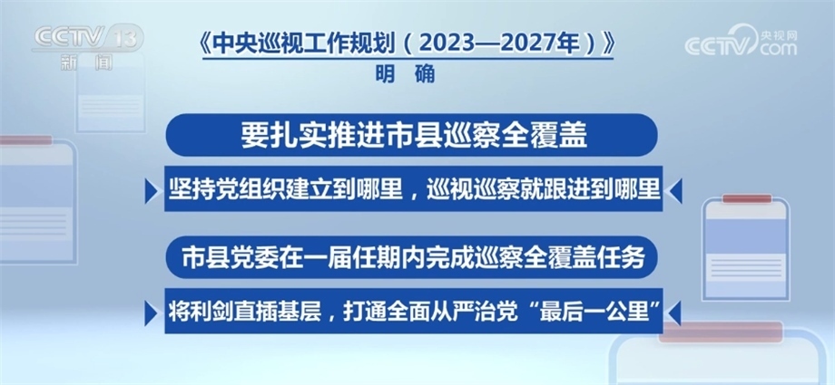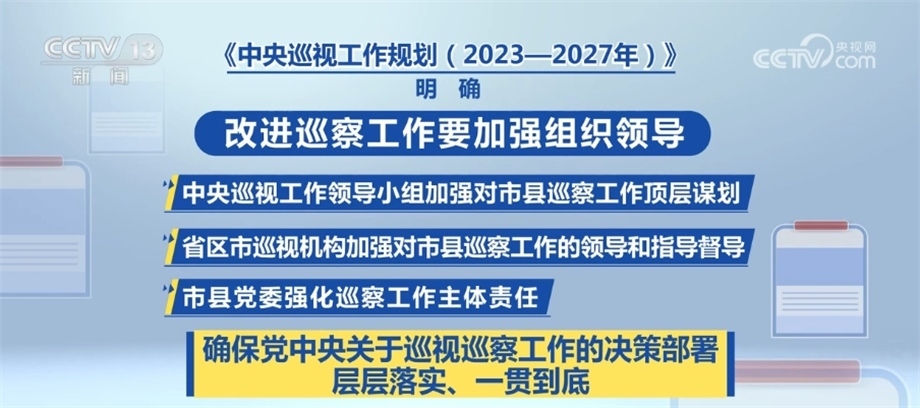 《中央巡視工作規(guī)劃(2023—2027年)》明確,改進巡察工作要加強組織領導。中央巡視工作領導小組加強對市縣巡察工作頂層謀劃,省區(qū)市巡視機構加強對市縣巡察工作的領導和指導督導,市縣黨委強化巡察工作主體責任,確保黨中央關于巡視巡察工作的決策部署層層落實、一貫到底。
