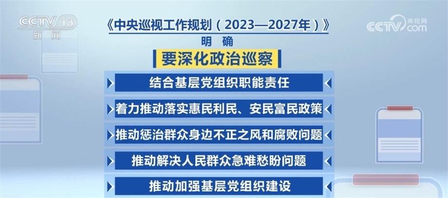央視網(wǎng)消息:近日,經(jīng)黨中央同意,中共中央辦公廳印發(fā)了《中央巡視工作規(guī)劃(2023—2027年)》,對今后5年的巡視工作作出了部署。一屆任期內實現(xiàn)巡視全覆蓋,是黨章規(guī)定的政治任務。通過什么樣的方式實現(xiàn)二十屆中央巡視全覆蓋?采取哪些措施高質量推進巡視全覆蓋?在此次印發(fā)的巡視工作規(guī)劃中都作出了要求。