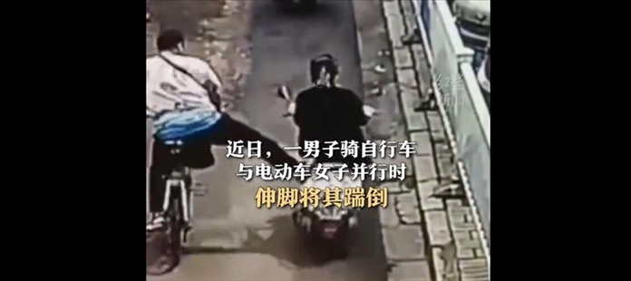 ·一男子騎自行車與一騎電動車女子并行時(shí)伸腳將其踹倒。街道辦回應(yīng):事發(fā)后當(dāng)?shù)嘏沙鏊槿胝{(diào)查,當(dāng)事雙方已和解。