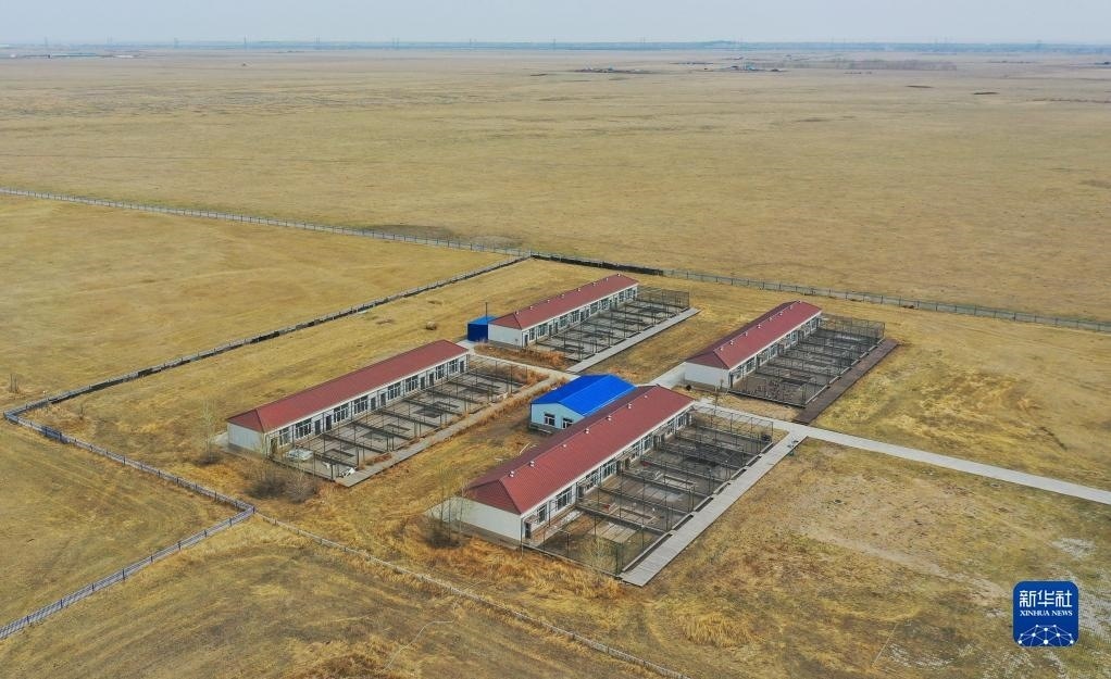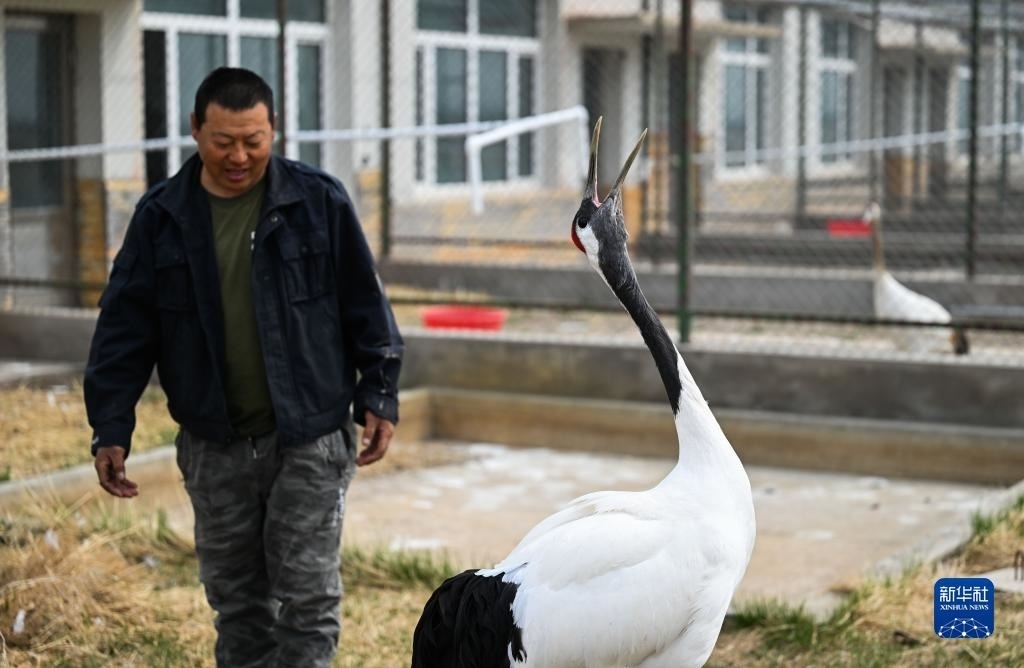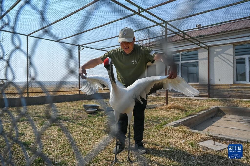 5月10日,徐沃德樂(lè)胡幫助一只救助的丹頂鶴張開(kāi)翅膀。