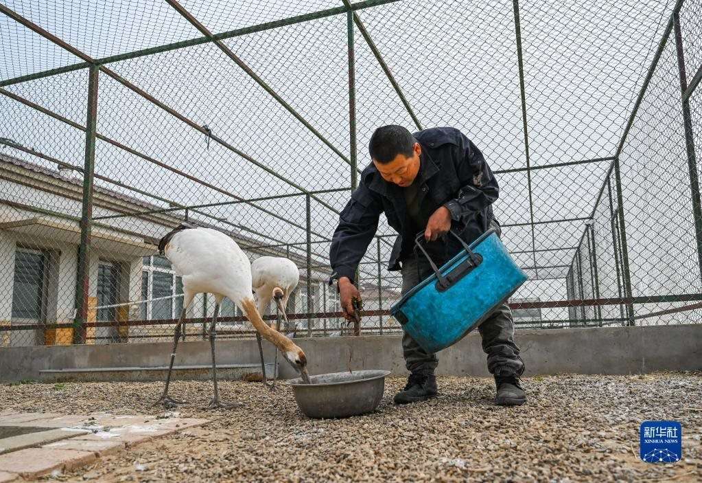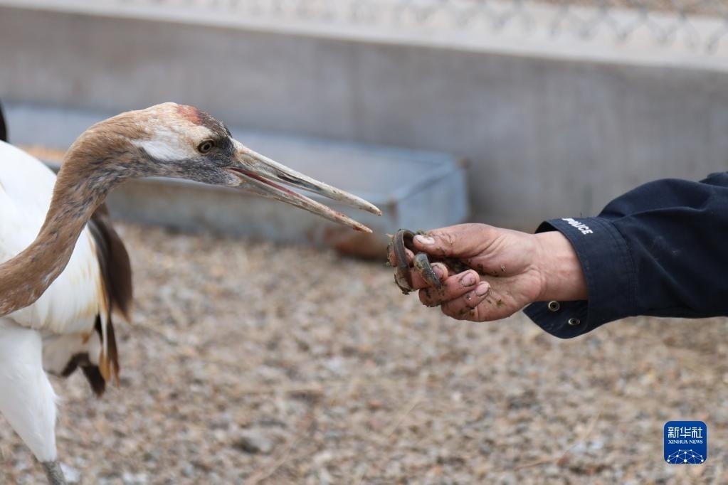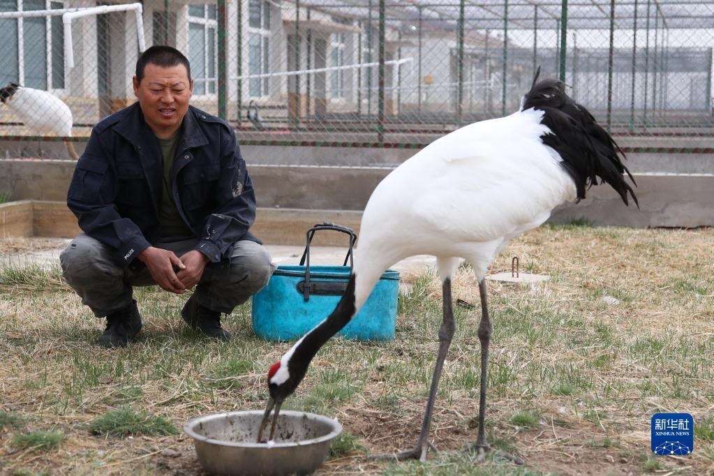 5月11日,徐沃德樂(lè)胡在觀察救助的丹頂鶴進(jìn)食。