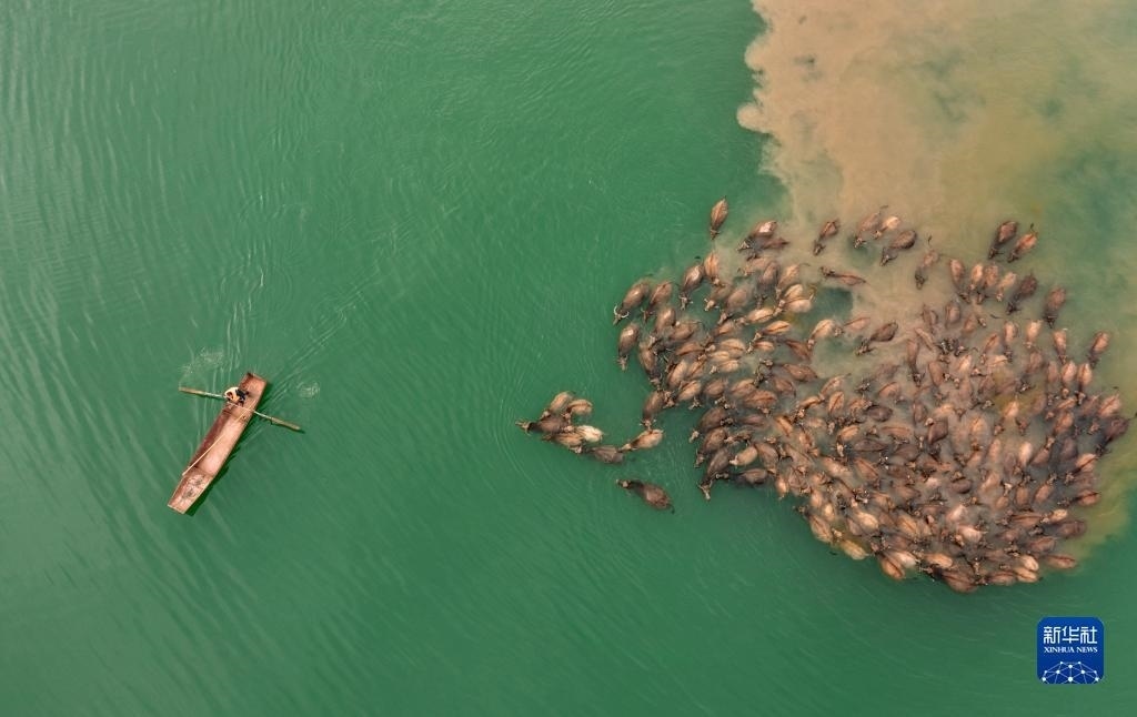 5月13日,在南充市蓬安縣相如鎮(zhèn)油房溝村嘉陵江段,成群結(jié)隊(duì)的水牛渡江(無人機(jī)照片)。