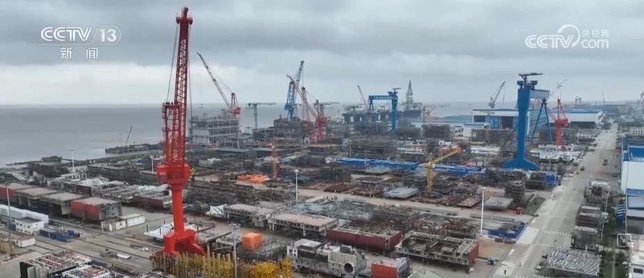 這些大家伙,都是世界技術(shù)比較領(lǐng)先的一些海工裝備。通過(guò)航拍的鏡頭,給大家展現(xiàn)一下,最遠(yuǎn)的是圓筒形超深水鉆探平臺(tái)。因?yàn)樗耐庑问仟?dú)特的圓筒型設(shè)計(jì),所以它的抗風(fēng)浪性、作業(yè)水深的能力非常得好,技術(shù)指標(biāo)創(chuàng)下多項(xiàng)世界第一。這家企業(yè),一共向國(guó)外交付了6艘同類型的產(chǎn)品。