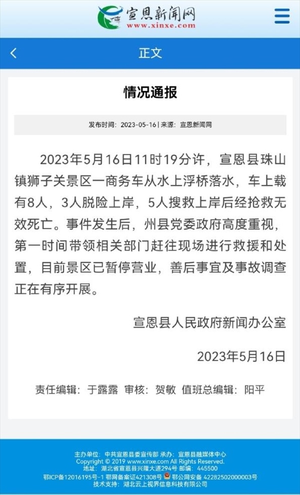 ·官方通報“恩施網(wǎng)紅浮橋墜車事故”:5人死亡,景區(qū)已暫停營業(yè)。
