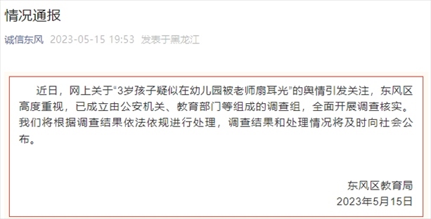 ·網(wǎng)傳“3歲孩子疑被幼師扇耳光”,官方通報:已成立調(diào)查組全面調(diào)查核實。