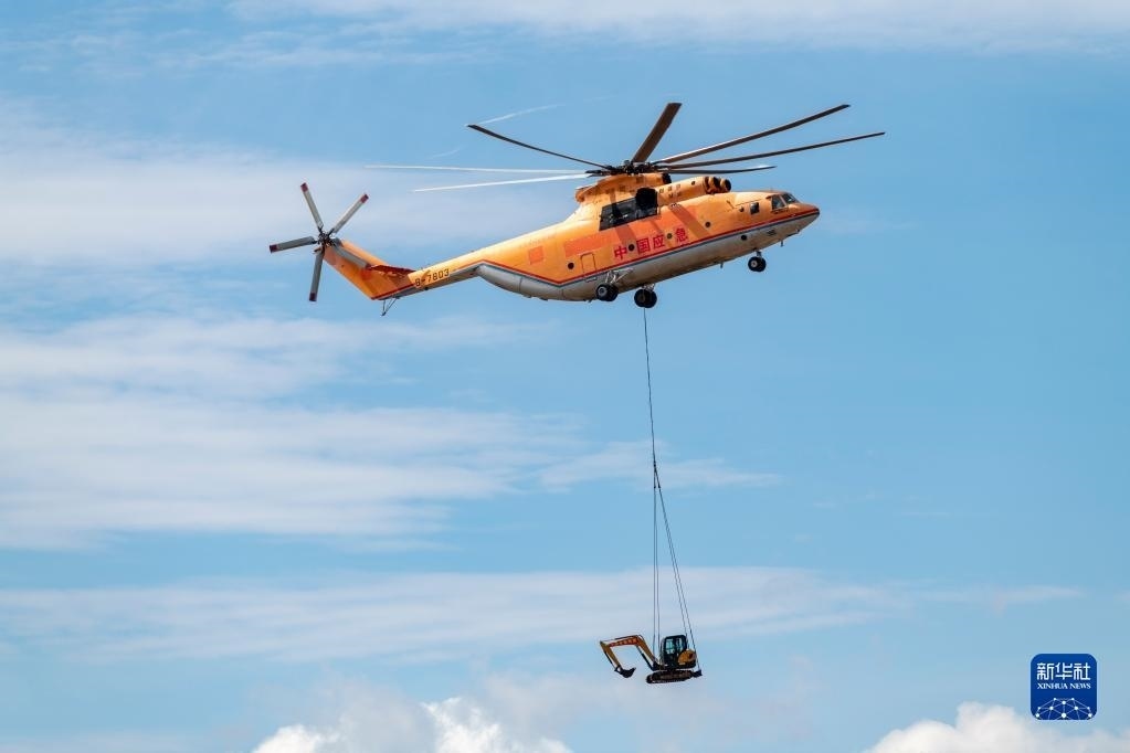 5月16日,一架參演直升機(jī)在麗江演習(xí)現(xiàn)場上空轉(zhuǎn)運(yùn)一臺挖掘機(jī)。