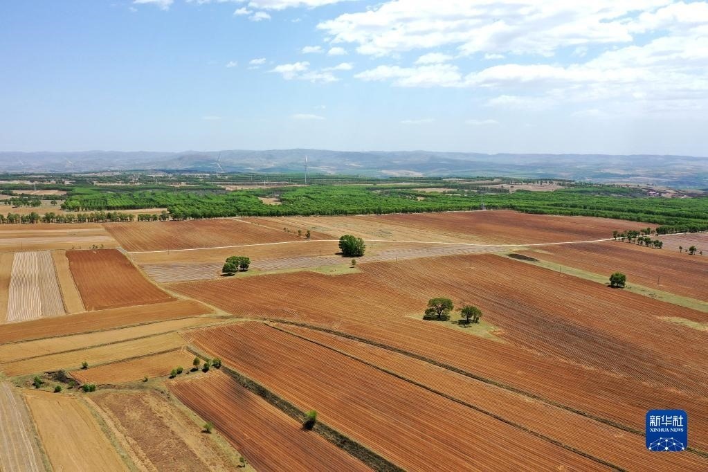 山西省右玉縣新城鎮(zhèn)田園景色(5月19日攝,無人機(jī)照片)。