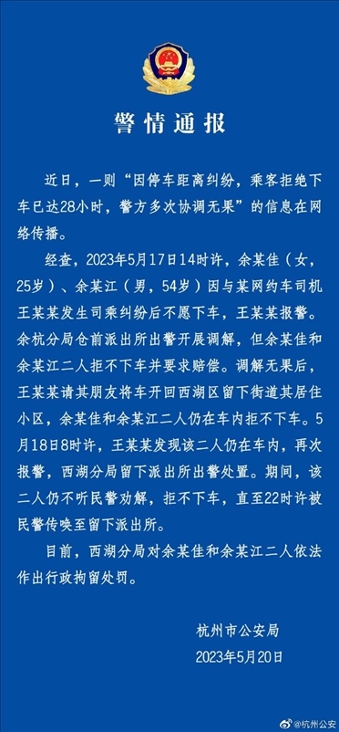·近日,杭州兩名乘客與網(wǎng)約車司機(jī)發(fā)生糾紛,賴在車上不走超過28小時,警方多次調(diào)解無果,最終兩名乘客被處以行政拘留。