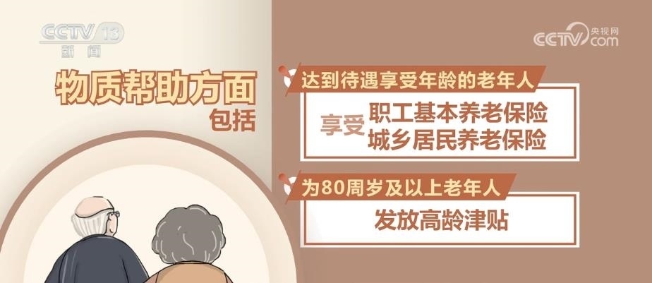 物質(zhì)幫助方面包括:達(dá)到待遇享受年齡的老年人享受職工基本養(yǎng)老保險(xiǎn)和城鄉(xiāng)居民養(yǎng)老保險(xiǎn);為80周歲及以上老年人發(fā)放高齡津貼;為經(jīng)濟(jì)困難的老年人提供養(yǎng)老服務(wù)補(bǔ)貼;為經(jīng)認(rèn)定生活不能自理的老年人提供護(hù)理補(bǔ)貼;為納入最低生活保障范圍的老年人提供最低生活保障;經(jīng)認(rèn)定符合條件的殘疾老年人享受困難殘疾人生活補(bǔ)貼和重度殘疾人護(hù)理補(bǔ)貼;對生活無著的流浪、乞討老年人依照有關(guān)規(guī)定給予救助。