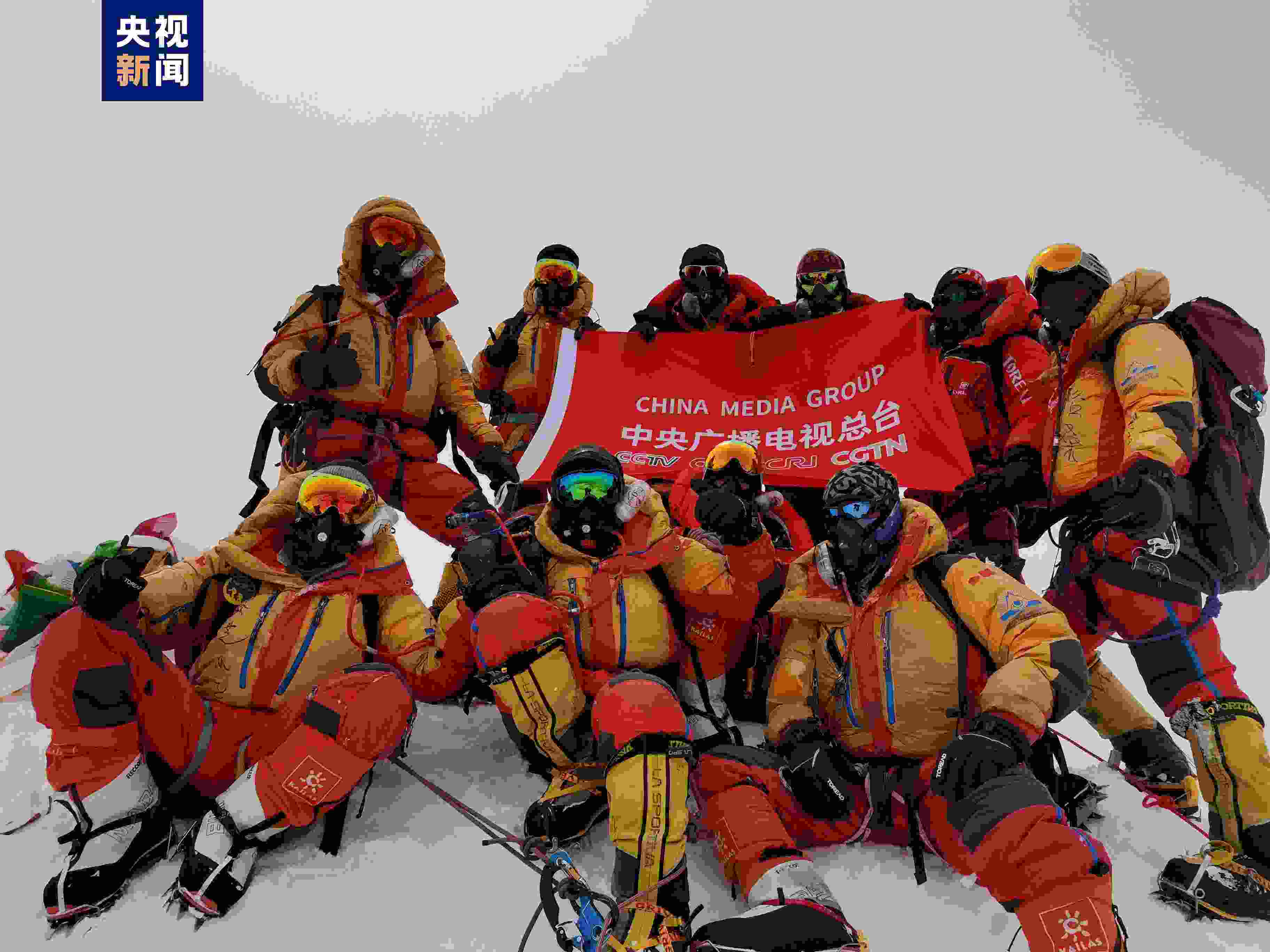 5月23日上午,2023“巔峰使命”珠峰科考登頂隊員在峰頂展示中央廣播電視總臺旗幟。