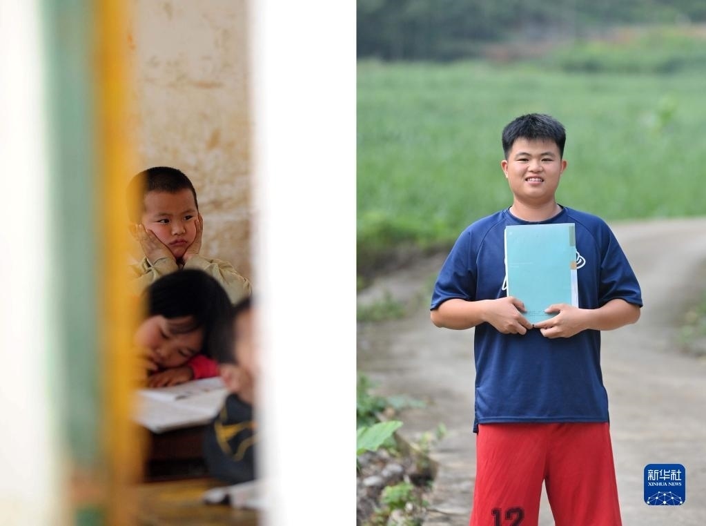 拼版照片:左圖為2012年3月27日,在大化瑤族自治縣大化鎮(zhèn)仁良小學(xué),6歲的韋康濤在教室里上課(新華社記者黃孝邦攝);右圖為在大化瑤族自治縣高級中學(xué)讀高二的韋康濤(新華社記者胡星宇 2023年5月21日攝)。韋康濤的夢想是考上理想的大學(xué)。