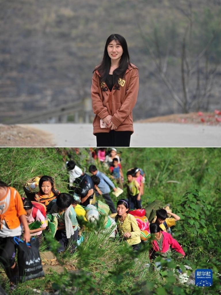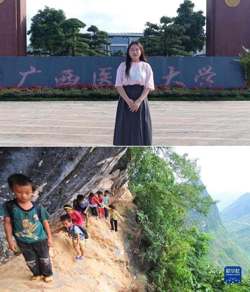 拼版照片:上圖為2023年5月27日,22歲的蒙秋艷站在她就讀的廣西醫(yī)科大學(xué)校門口(新華社發(fā));下圖為2012年9月3日,在大化瑤族自治縣板升鄉(xiāng)弄雷村哈保屯,11歲的蒙秋艷(右一)在懸崖邊護著低年級的小伙伴回家(新華社記者黃孝邦攝)。2021年,蒙秋艷以優(yōu)異的成績,考取廣西醫(yī)科大學(xué)。