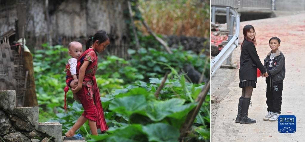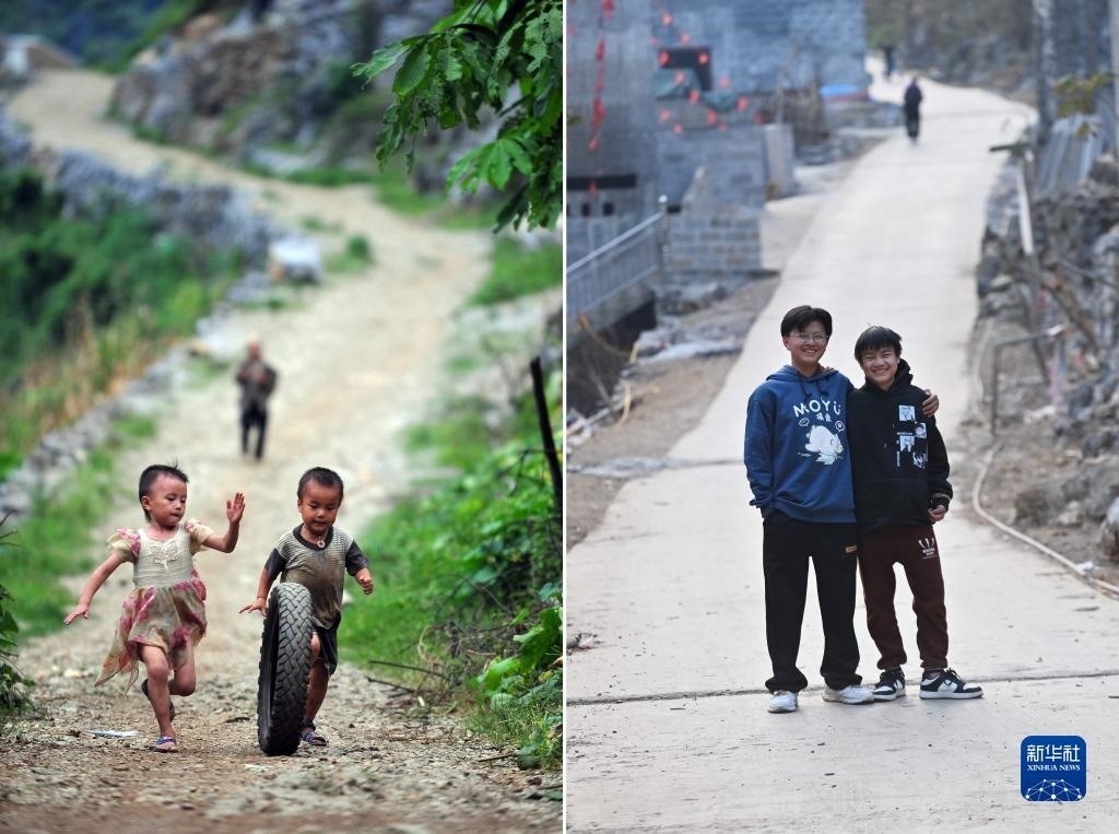 拼版照片:左圖為2012年7月16日,在大化瑤族自治縣板升鄉(xiāng)弄勇村,4歲的蒙宣宏(左)穿著姐姐的舊衣服和同為4歲的藍小帥在一起玩耍;右圖為2023年1月21日,在大化瑤族自治縣板升鄉(xiāng)弄勇村,蒙宣宏(左)和藍小帥合影。蒙宣宏和藍小帥目前分別在板升鄉(xiāng)和大化縣城讀初二。