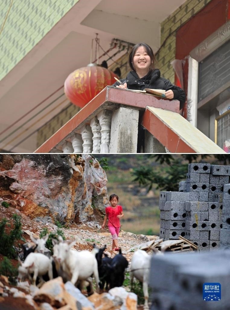 拼版照片:上圖為2023年1月16日,在大化瑤族自治縣板升鄉(xiāng)弄勇村,正在讀初中的藍秀雪在家門口學(xué)習(xí);下圖為2013年7月14日,5歲的藍秀雪在放羊。16歲的藍秀雪即將參加中考,希望能考上一所好高中。