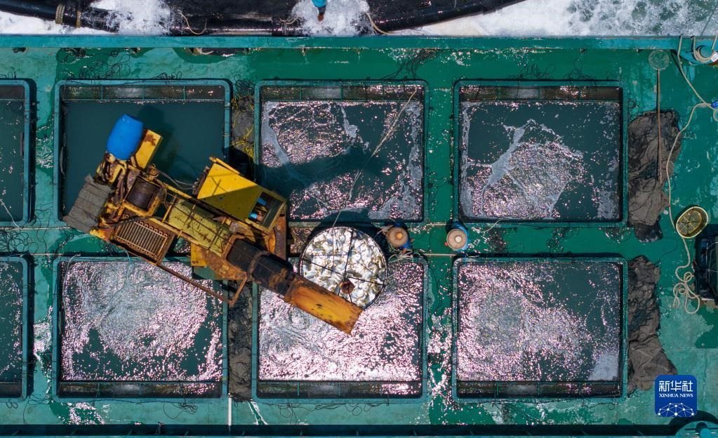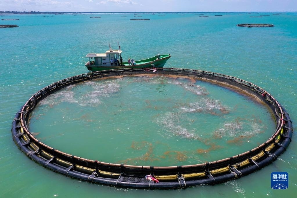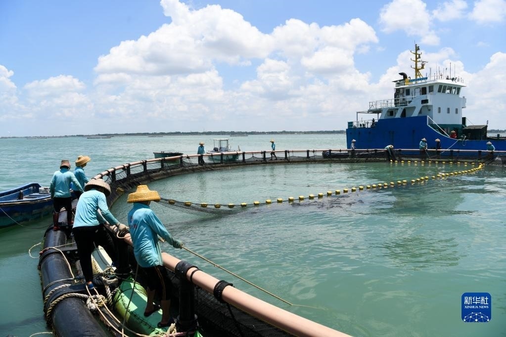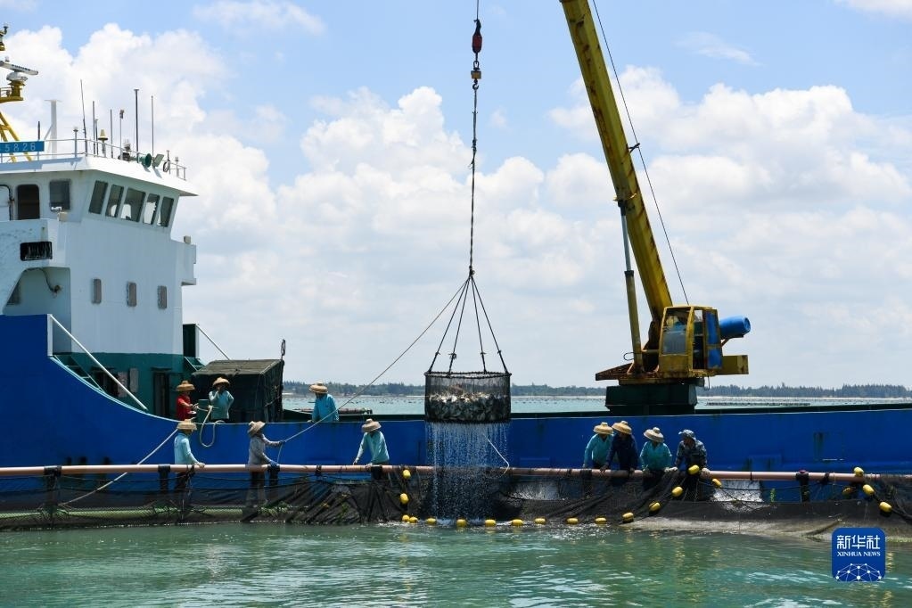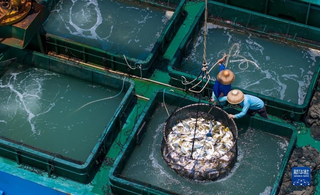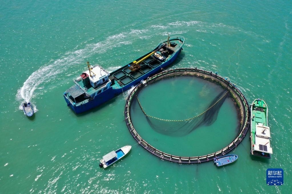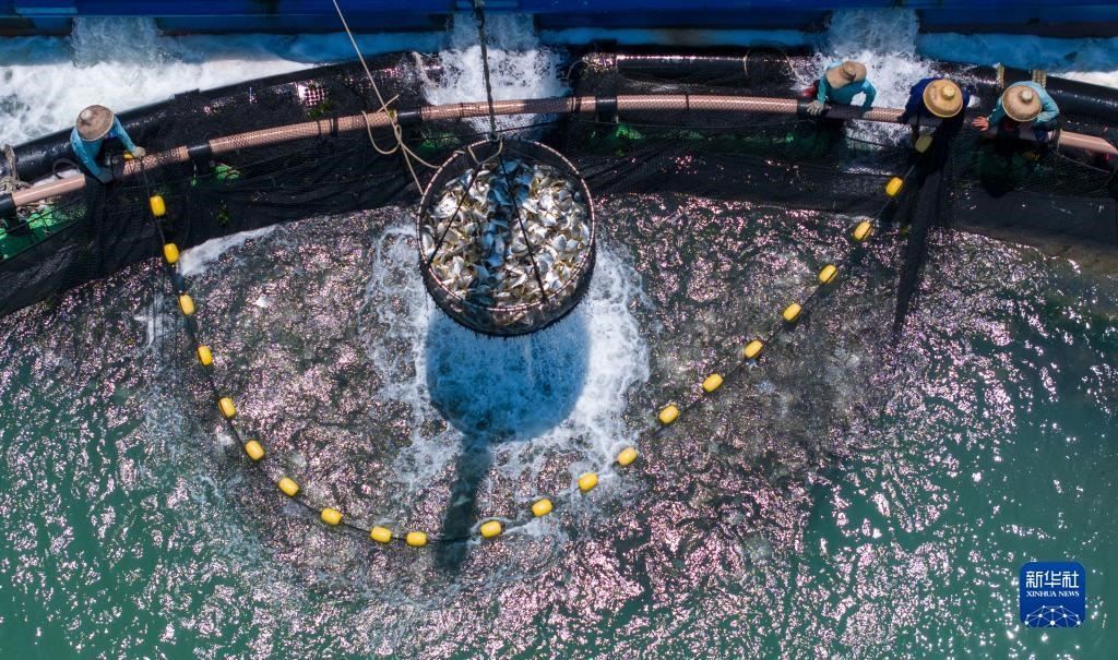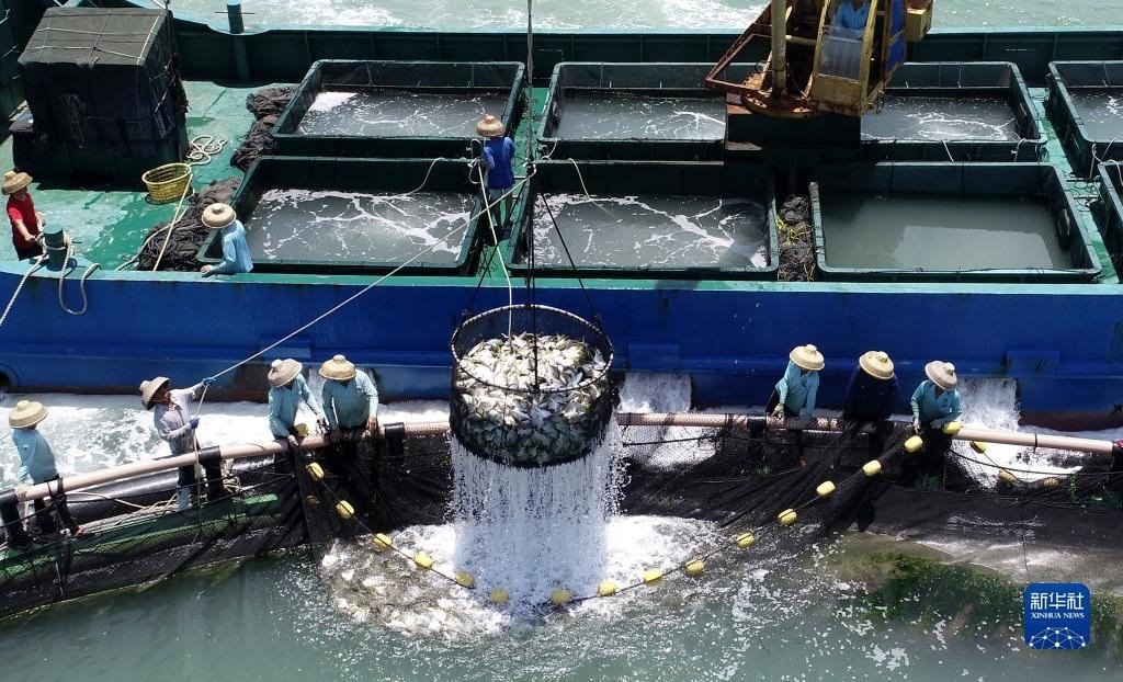5月27日,在湛江市徐聞縣西連鎮(zhèn),漁業(yè)工人從徐聞國(guó)橋深海養(yǎng)殖有限公司的金鯧魚深海網(wǎng)箱捕魚(無人機(jī)照片)。
