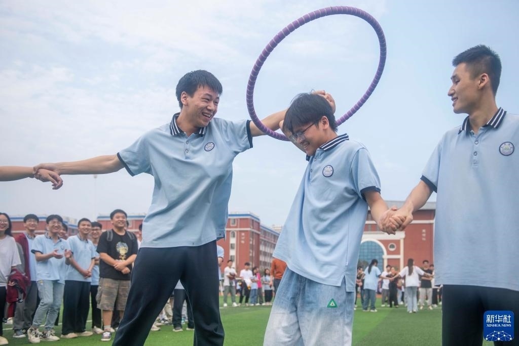 5月25日,在湖南省永州市道縣道州玉潭(東陽(yáng))學(xué)校,高三學(xué)生在操場(chǎng)上做減壓趣味活動(dòng)。