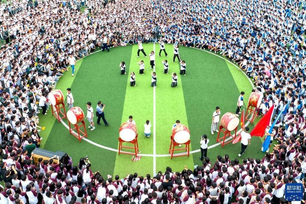 5月29日,湖北省宣恩縣第一高級(jí)中學(xué)學(xué)生在快閃活動(dòng)中表演鼓舞(無(wú)人機(jī)照片)。