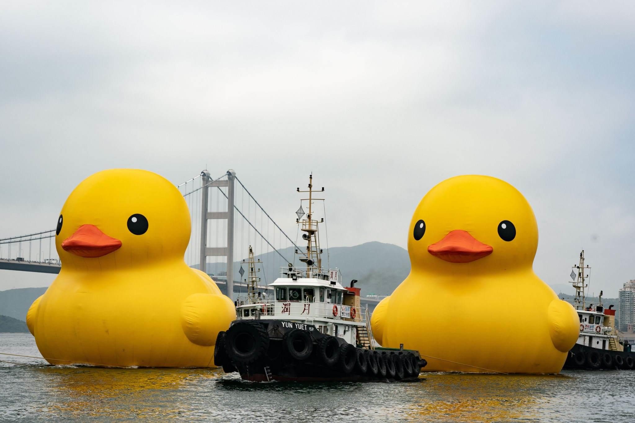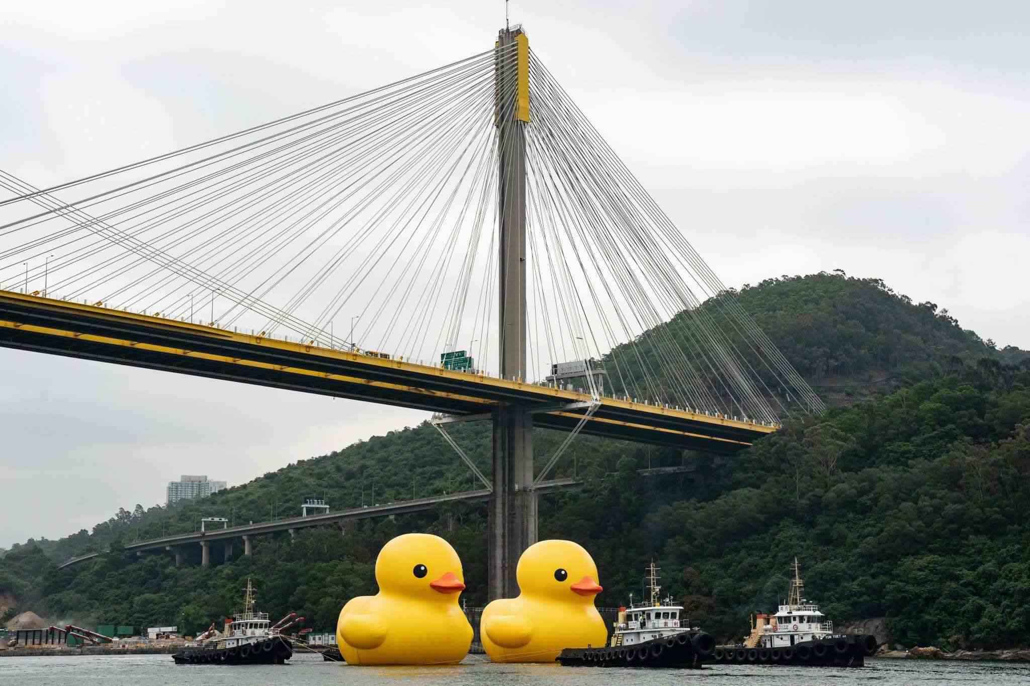 2023年5月25日,香港,兩只18米高的巨型橡皮鴨現(xiàn)身于青衣海域,引市民關(guān)注。視覺中國(guó)