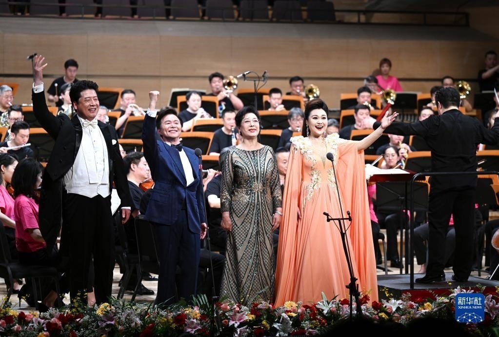 5月25日,在天津大劇院音樂廳,歌唱家王澤南(左一)、王宏偉(左二)、關(guān)牧村(左三)、張晏蓉等在舞臺(tái)上演出。