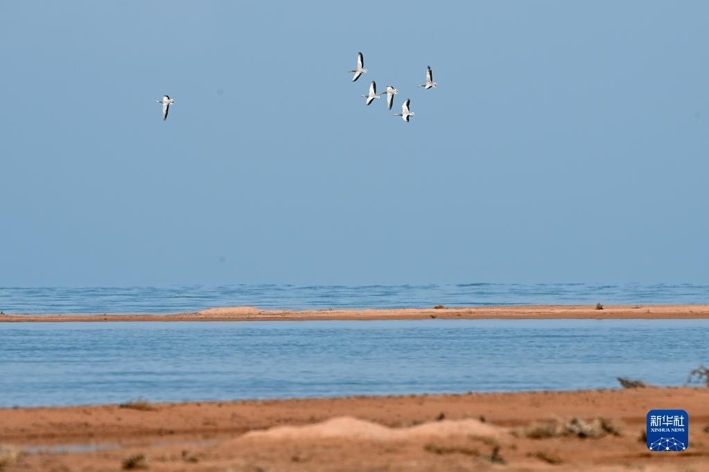 一群斑頭雁在阿爾金山國家級自然保護區(qū)飛翔(5月23日攝)。