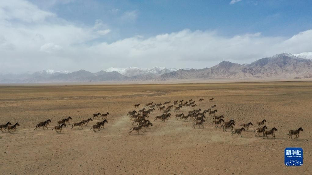 一群藏野驢在阿爾金山國家級自然保護區(qū)奔跑(5月23日攝)。