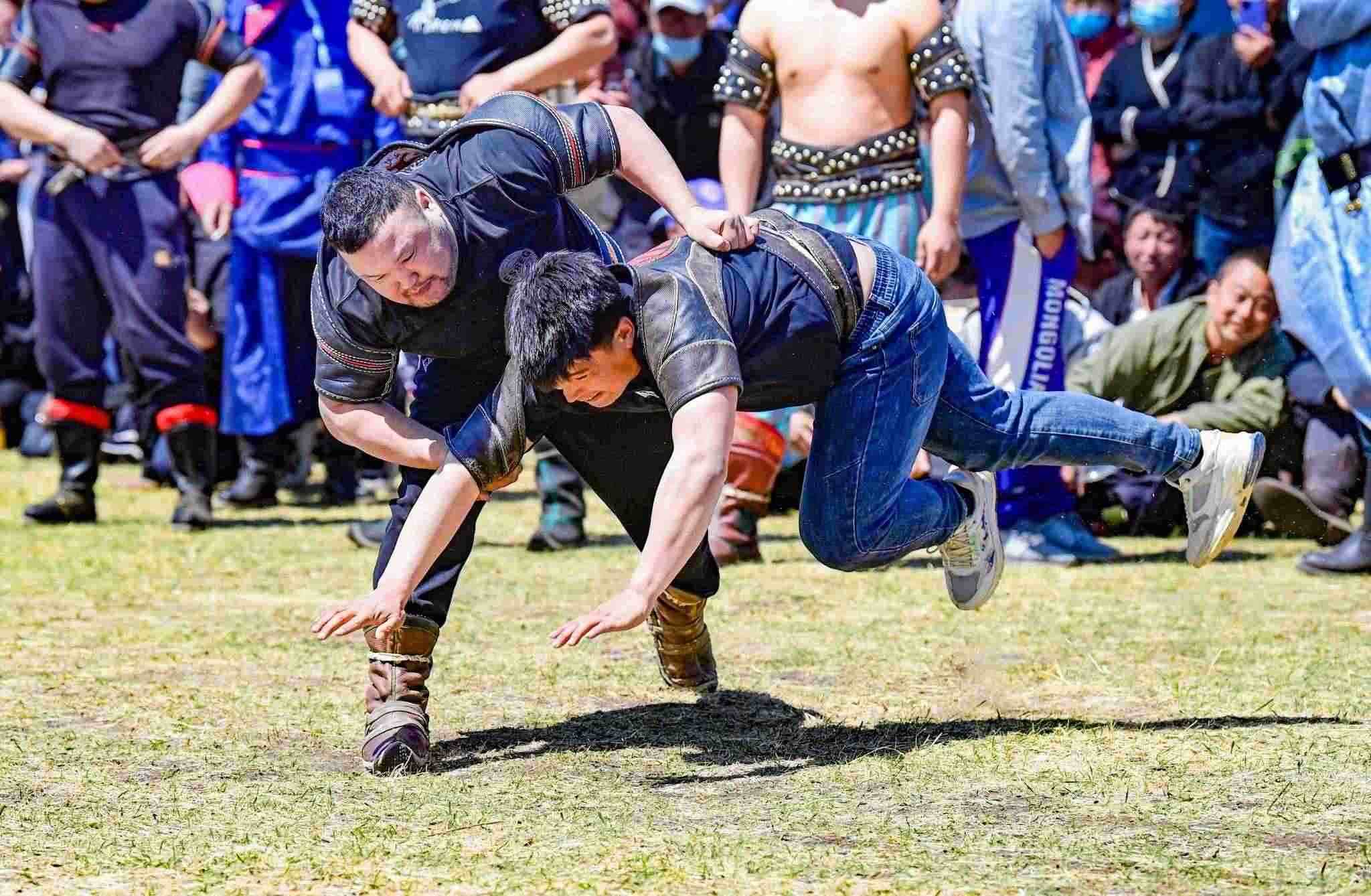 2023年5月26日,內(nèi)蒙古興安盟,科爾沁右翼前旗德伯斯鎮(zhèn)阿日林一合嘎查舉行首屆那達慕,設置的賽馬、布魯、搏克、拔河等傳統(tǒng)體育娛樂項目,吸引嘎查周邊500余名牧民參加比賽,喜慶牧業(yè)豐收季。視覺中國