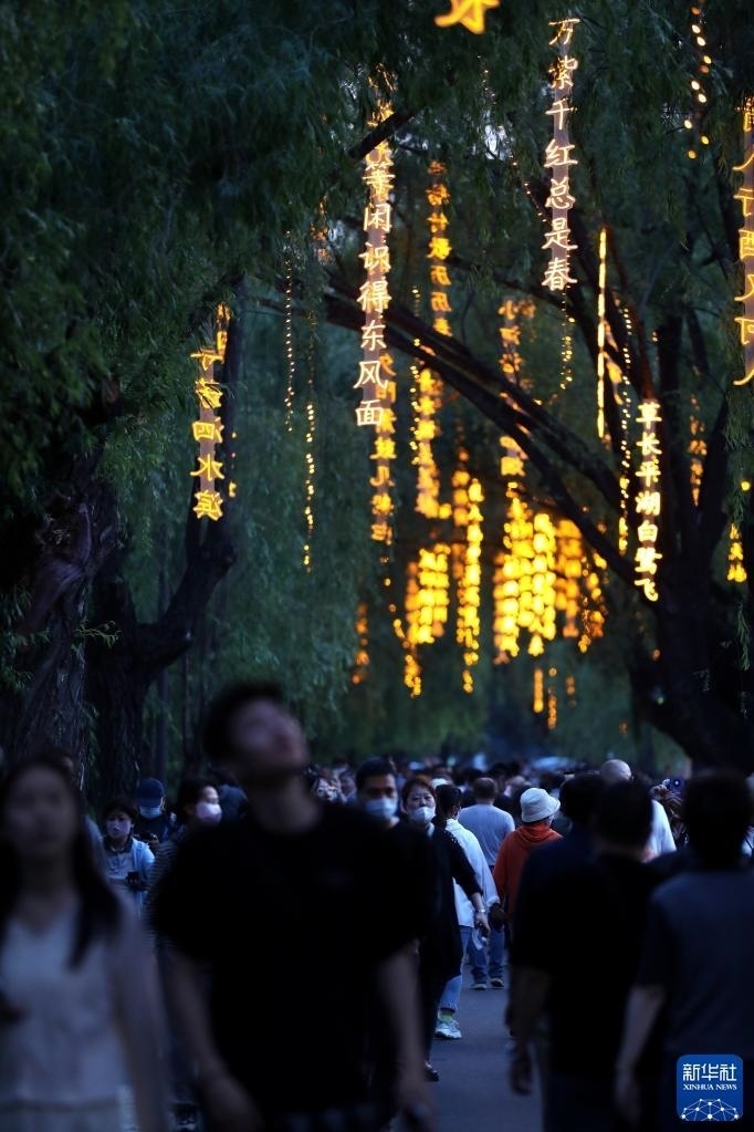 近日,沈陽(yáng)市萬(wàn)泉公園打造的一條詩(shī)詞漫道成為游客和市民的網(wǎng)紅打卡地。每當(dāng)夜幕降臨,幾十首古詩(shī)詞彩燈在這條300余米道路的樹(shù)梢枝頭熠熠閃爍,以詩(shī)入景,一步一詩(shī)。新華社記者 姚劍鋒 攝