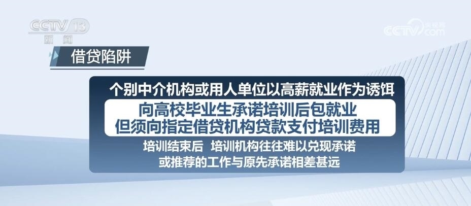個(gè)別中介機(jī)構(gòu)或用人單位以高薪就業(yè)作為誘餌,向高校畢業(yè)生承諾培訓(xùn)后包就業(yè),但須向指定借貸機(jī)構(gòu)貸款支付培訓(xùn)費(fèi)用。培訓(xùn)結(jié)束后,培訓(xùn)機(jī)構(gòu)往往難以?xún)冬F(xiàn)承諾,或推薦的工作與原先承諾相差甚遠(yuǎn)。