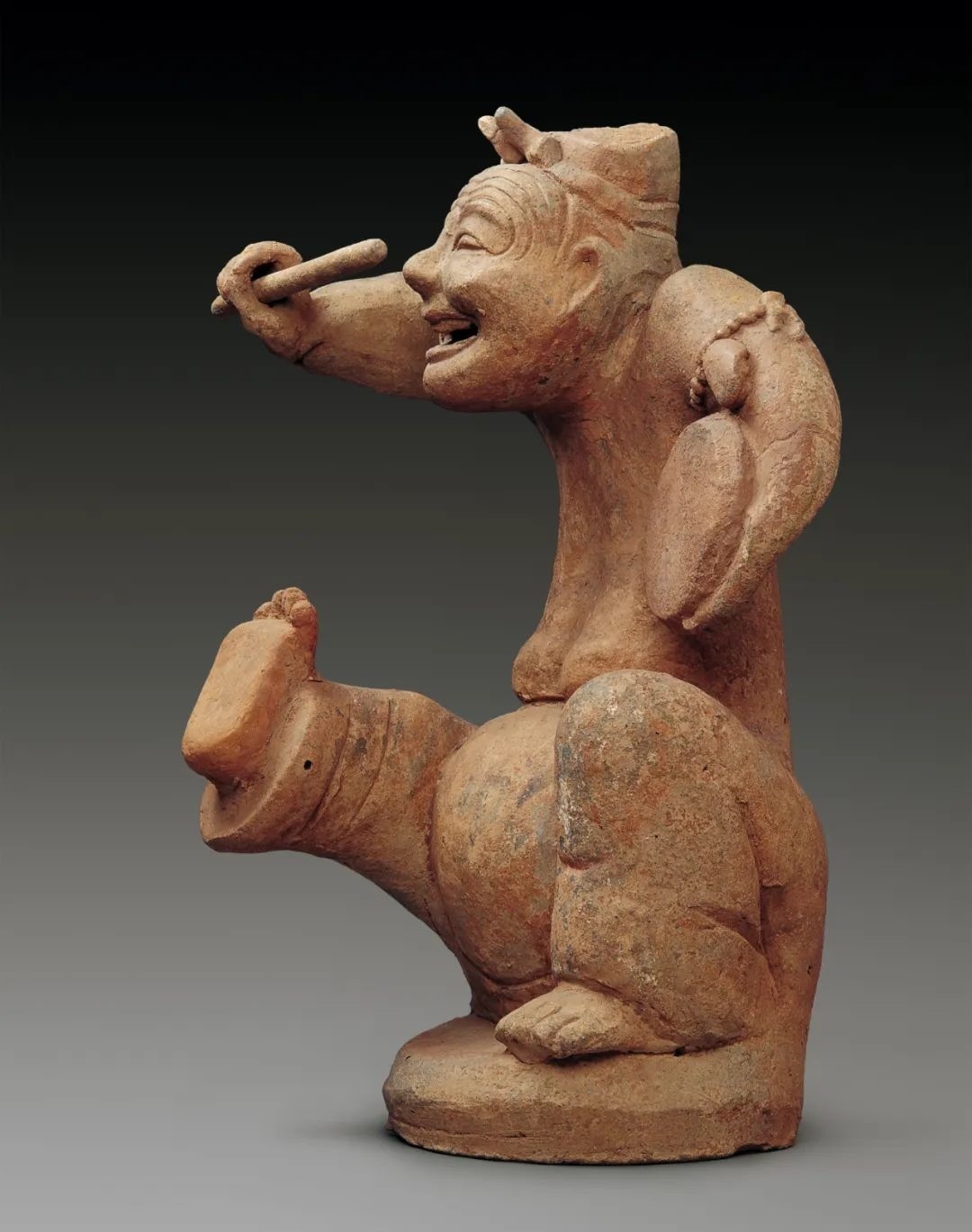 漢代民間極為盛行說唱表演。這件陶俑袒胸露腹,著褲赤足,左臂挾鼓,右手舉槌,作擊鼓說唱表演,神態(tài)詼諧,動作夸張,是一件富有濃厚民間氣息和地方風貌的優(yōu)秀雕塑作品。在四川的東漢墓中先后出土多件形象類似的擊鼓說唱俑,這說明當時蜀地說唱表演頗為流行。