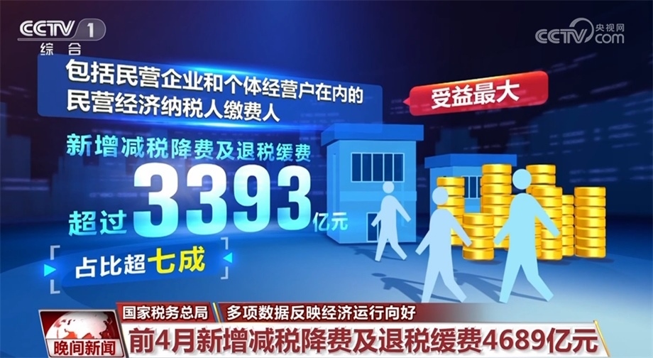 國家稅務(wù)總局?jǐn)?shù)據(jù)顯示,今年1—4月,全國新增減稅降費(fèi)及退稅緩費(fèi)4689億元。分經(jīng)濟(jì)類型看,包括民營企業(yè)和個體經(jīng)營戶在內(nèi)的民營經(jīng)濟(jì)納稅人繳費(fèi)人新增減稅降費(fèi)及退稅緩費(fèi)超過3393億元,占比超七成,受益最大。